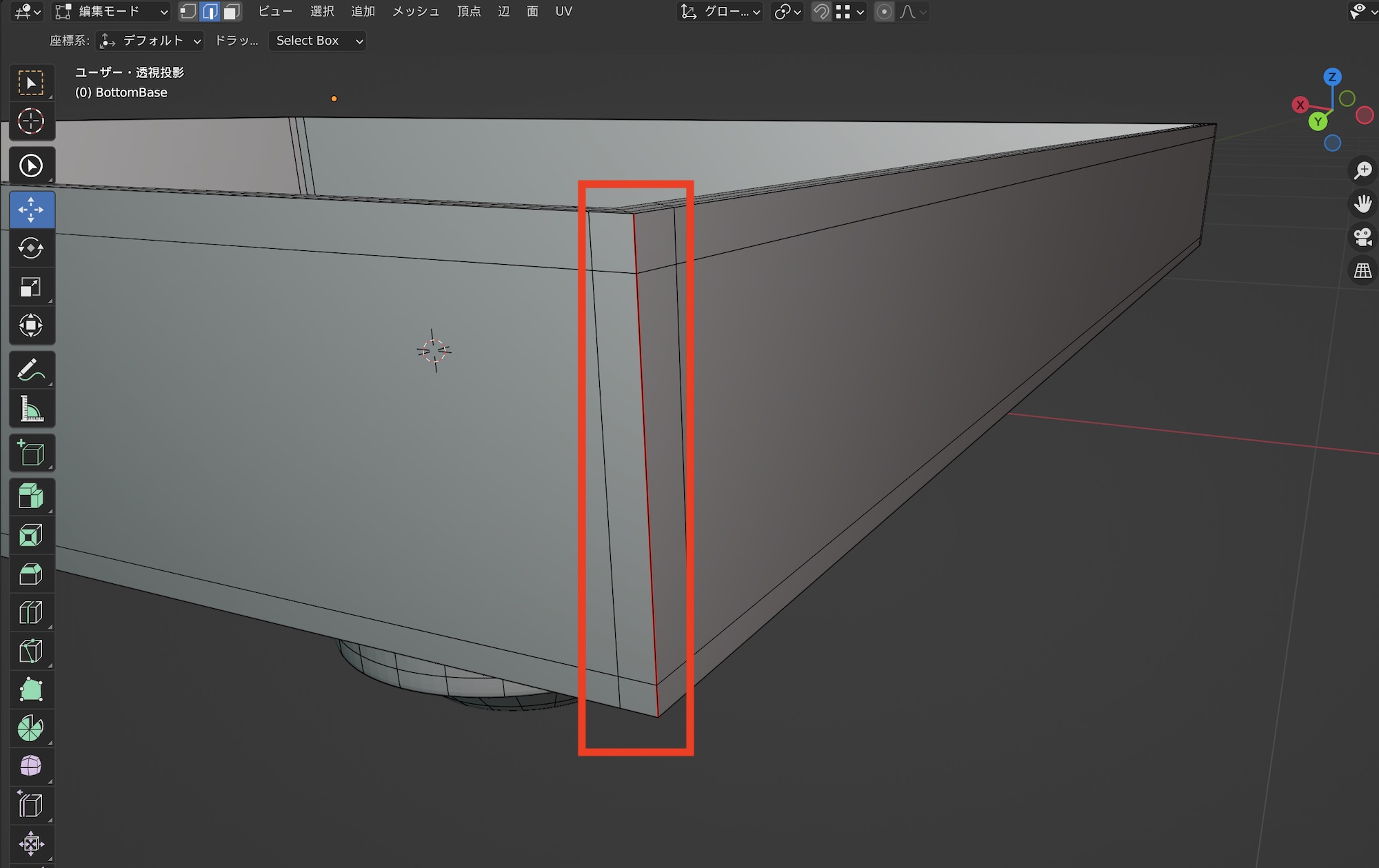 シームは箱を展開するように、3次元のオブジェクトを2次元の平面にしていくために必要な切れ目となります。シームを追加する場所はどこでも良いのですが、テクスチャの境目がはっきりと分かる場合があるので、最終レンダリングでは映らない背面や下部にシームを入れることをおすすめします。 筆者の場合は内部、側面上部、側面下部、側面と下部のように分けていきたいので、編集モードの辺選択モードに切り替えてシームを追加する辺(エッジ)を選択していきます。
