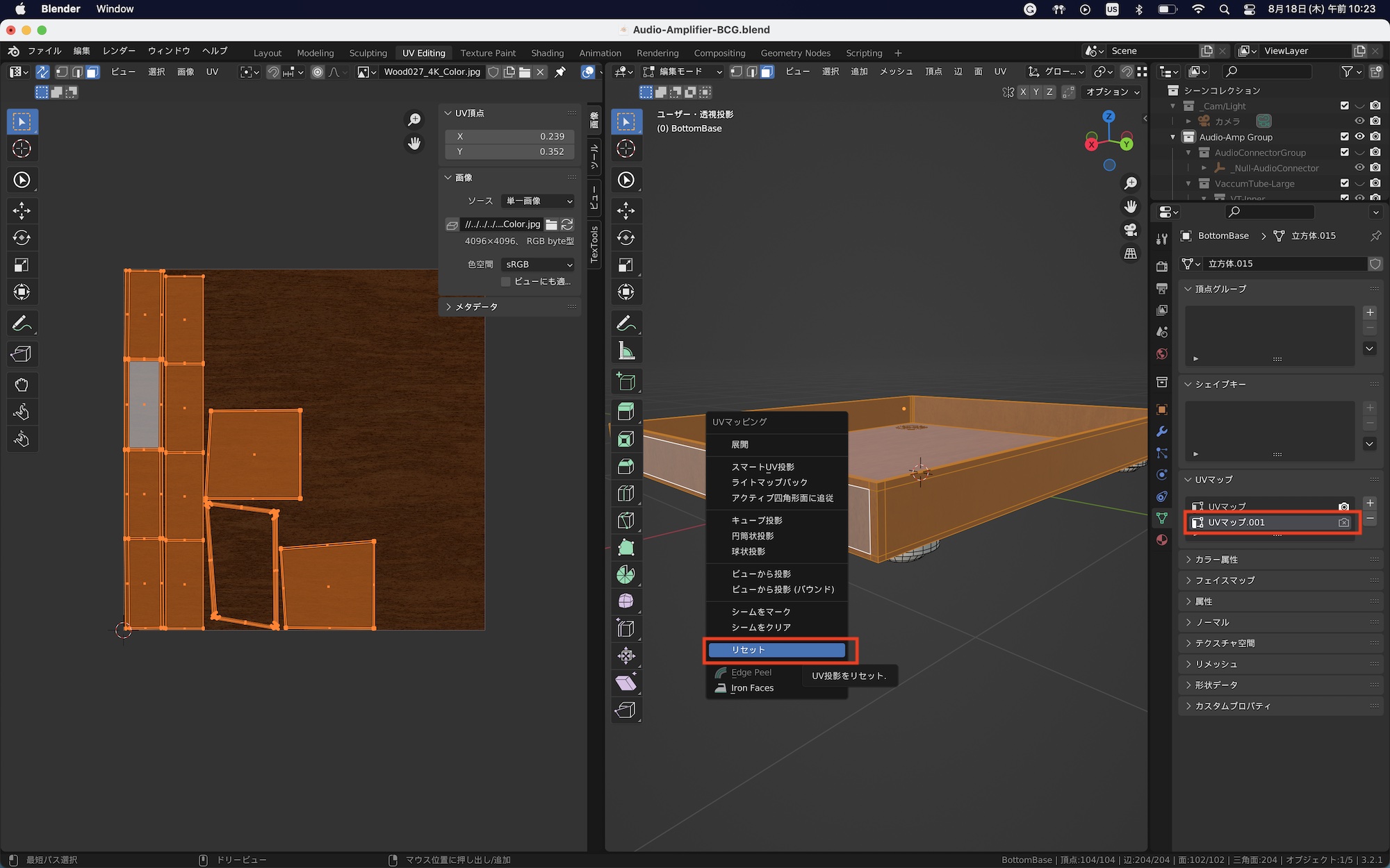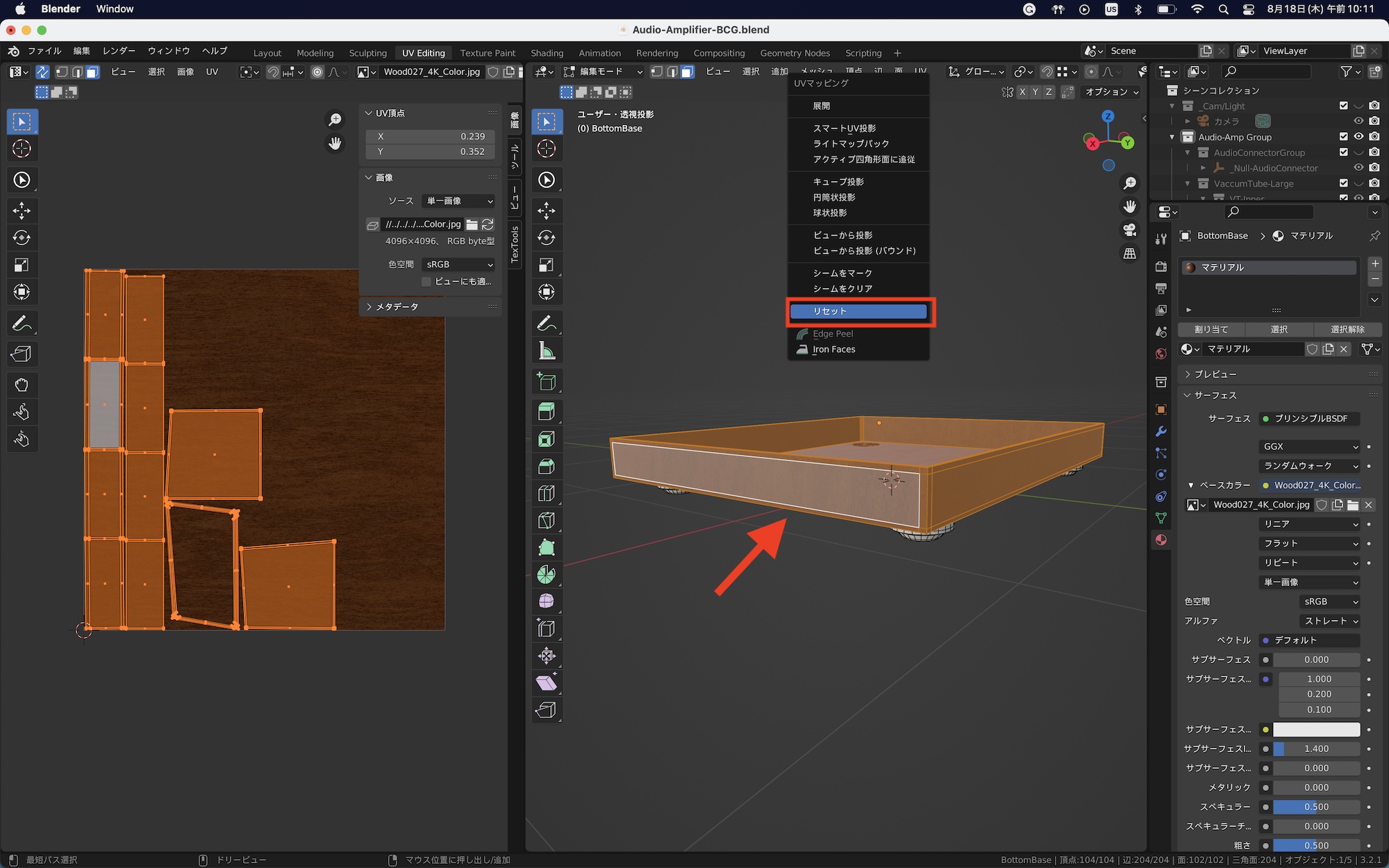 UVマップをリセットする場合は「A」キーを使って全ての面を選択し、「U」キーを押して「リセット」をクリックすると良いでしょう。