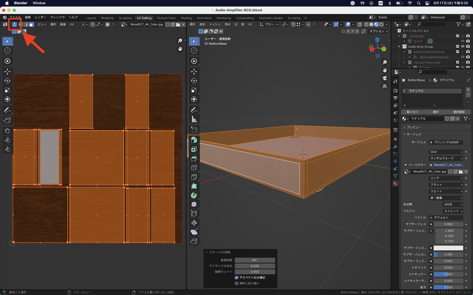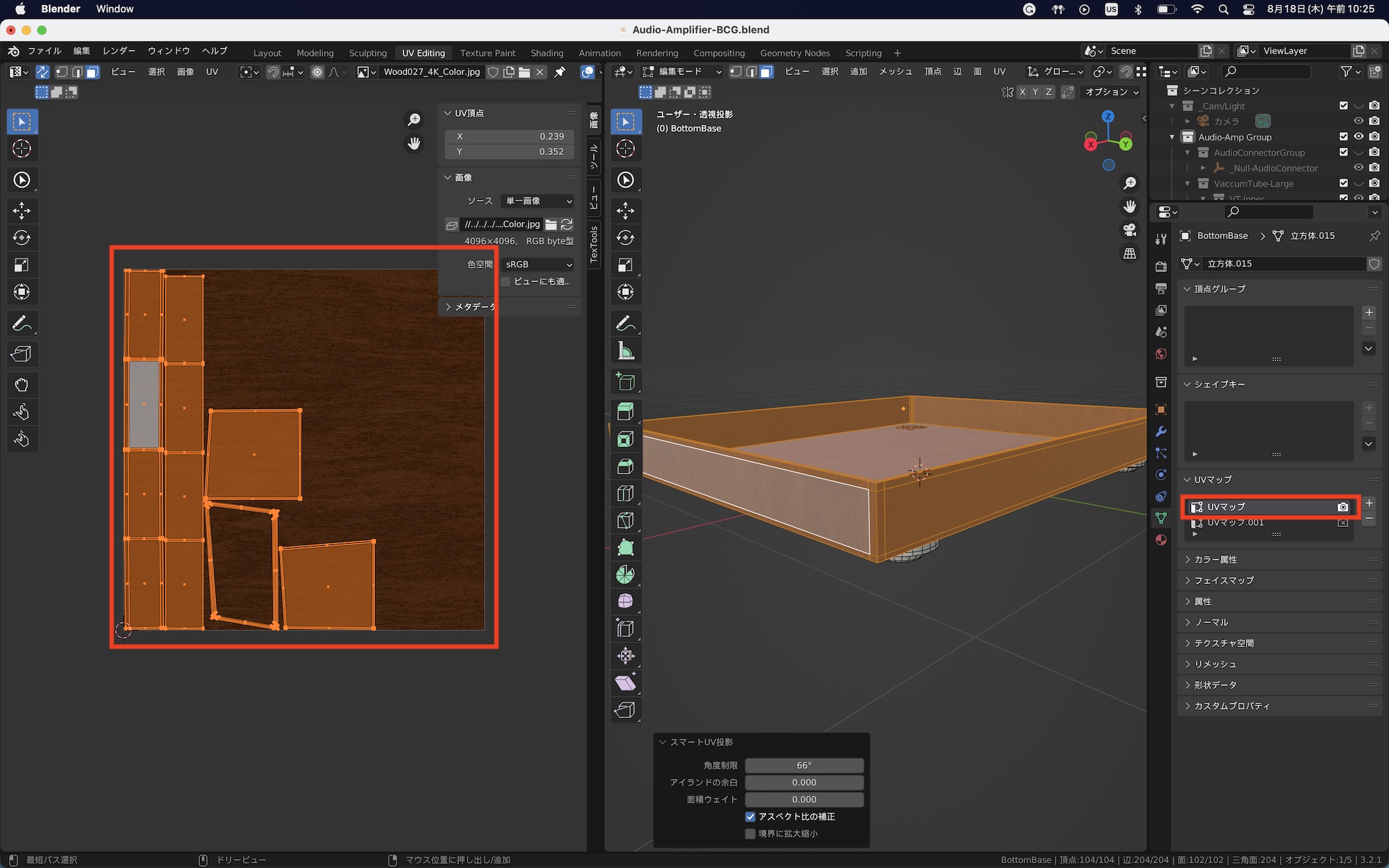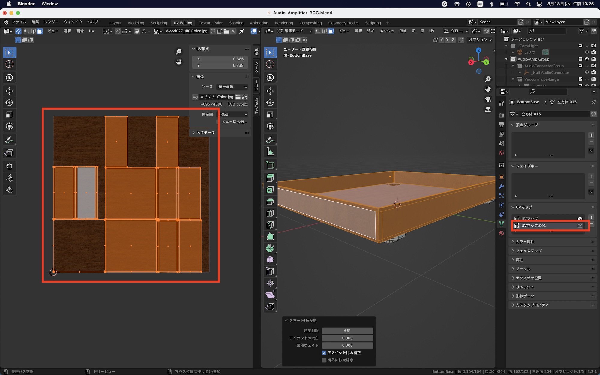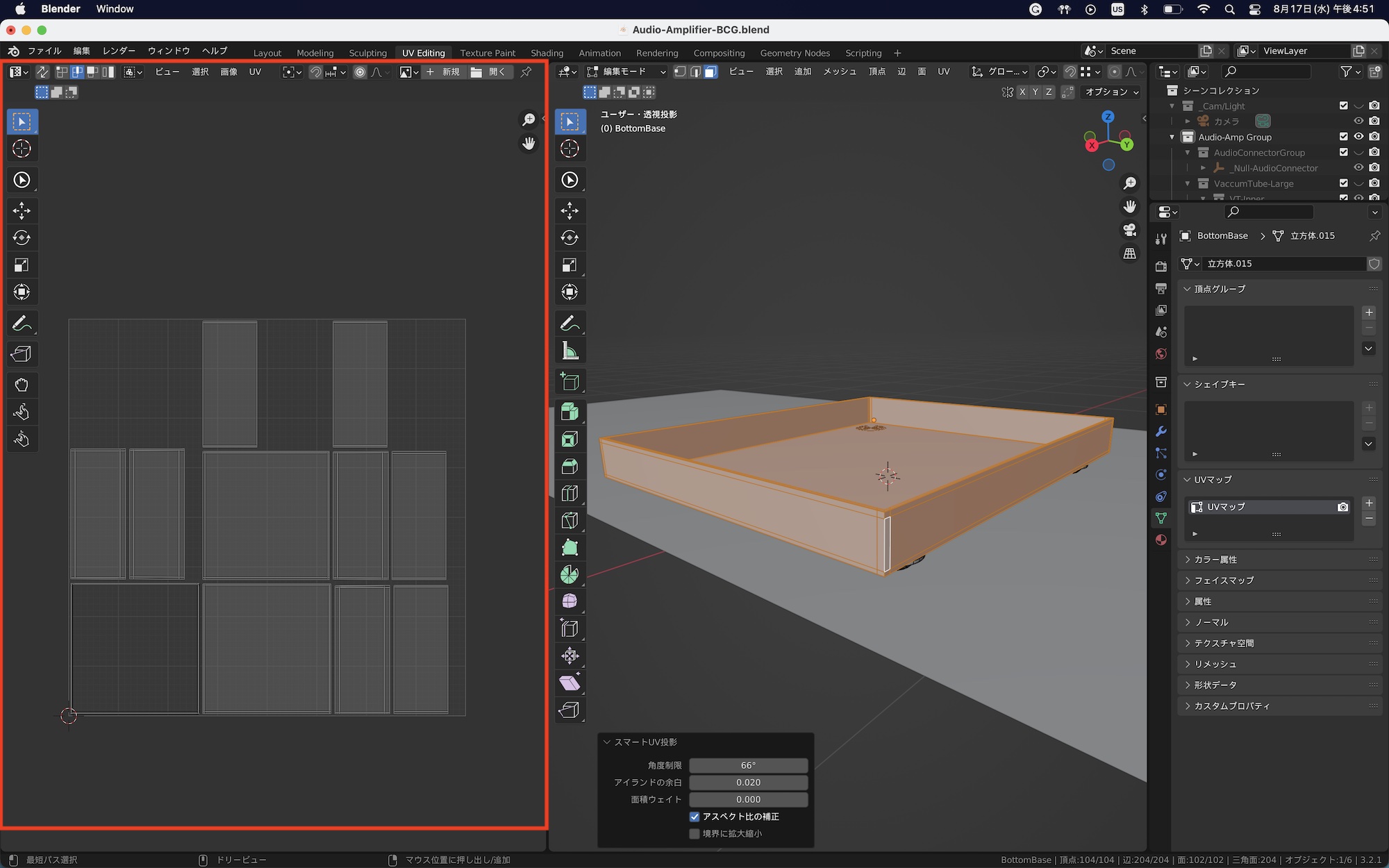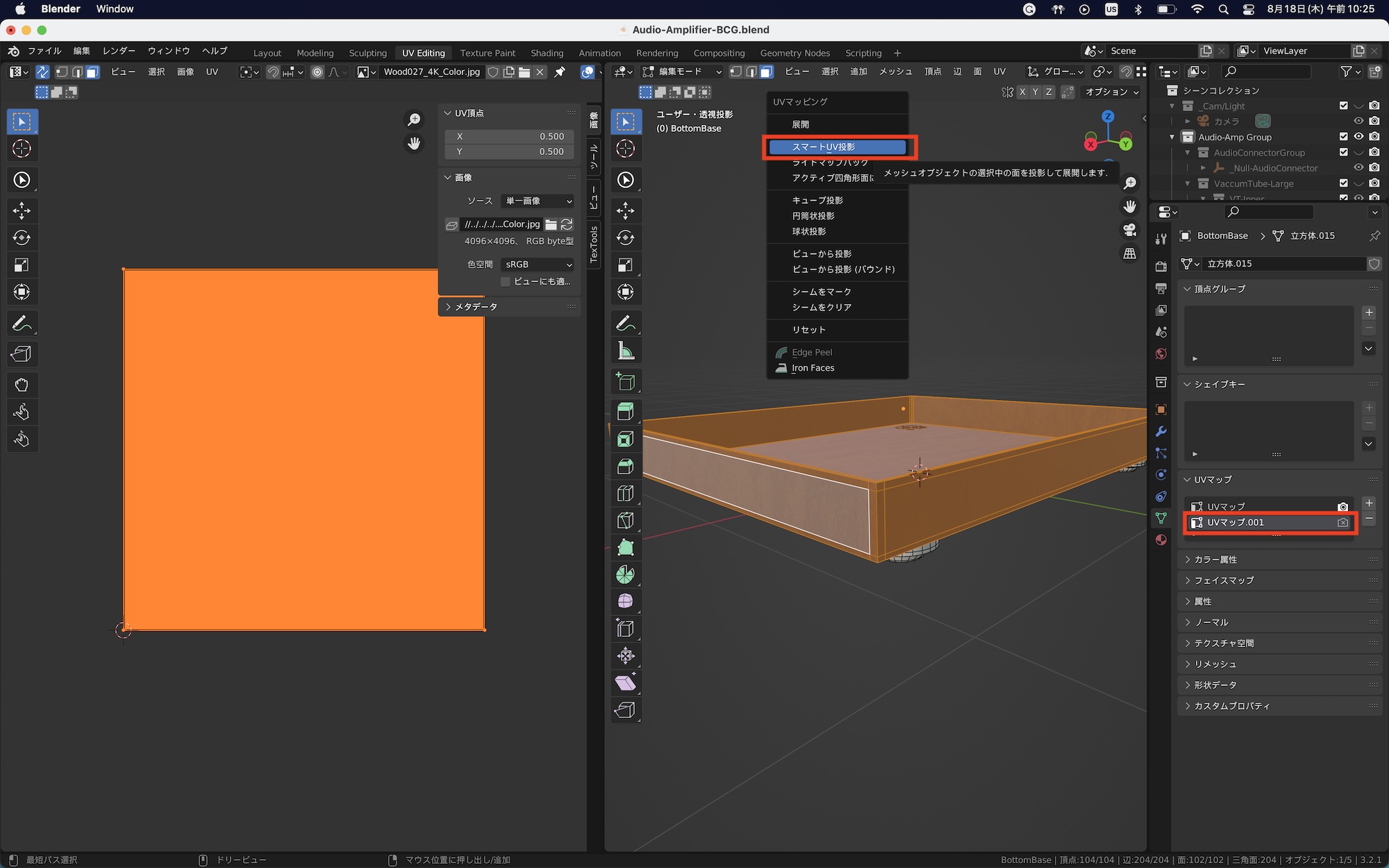 新しく作成した「UVマップ.001」を選択した状態でスマートUV投影を行ってUV展開します。