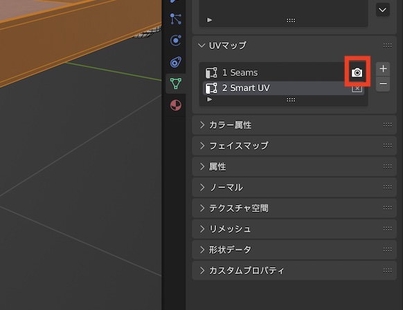 UVマップはいくつも追加することができますが、レンダリングを行う際は一つのUVマップしか指定できないので、UVマップの一番右にあるカメラアイコンをクリックして反映させたいUVマップを指定してください。