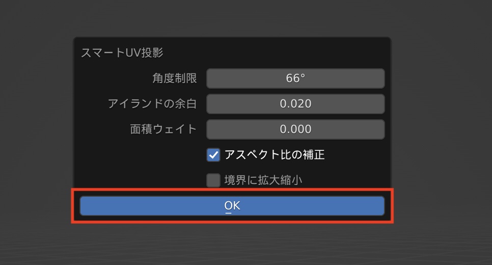 オプションが現れますが、ひとまずそのままにして「OK」をクリックすると、左側のUVエディターのビューポートにUVアイランドが表示されるようになります。