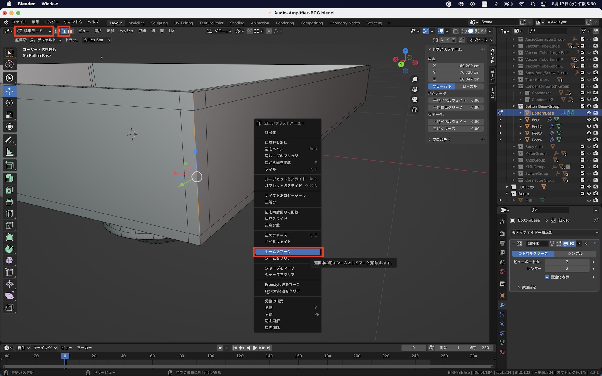 辺を選択して右クリックして「シームをマーク」をクリックすると選択した辺が赤くなります。これでシームが追加された状態となります。