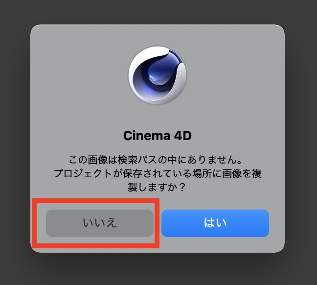 「発光」の項目を開いて「テクスチャ」の項目にダウンロードしたHDRIをドラッグします。「この画像は検索パスの中にありません」と出た場合は「いいえ」をクリックしましょう。