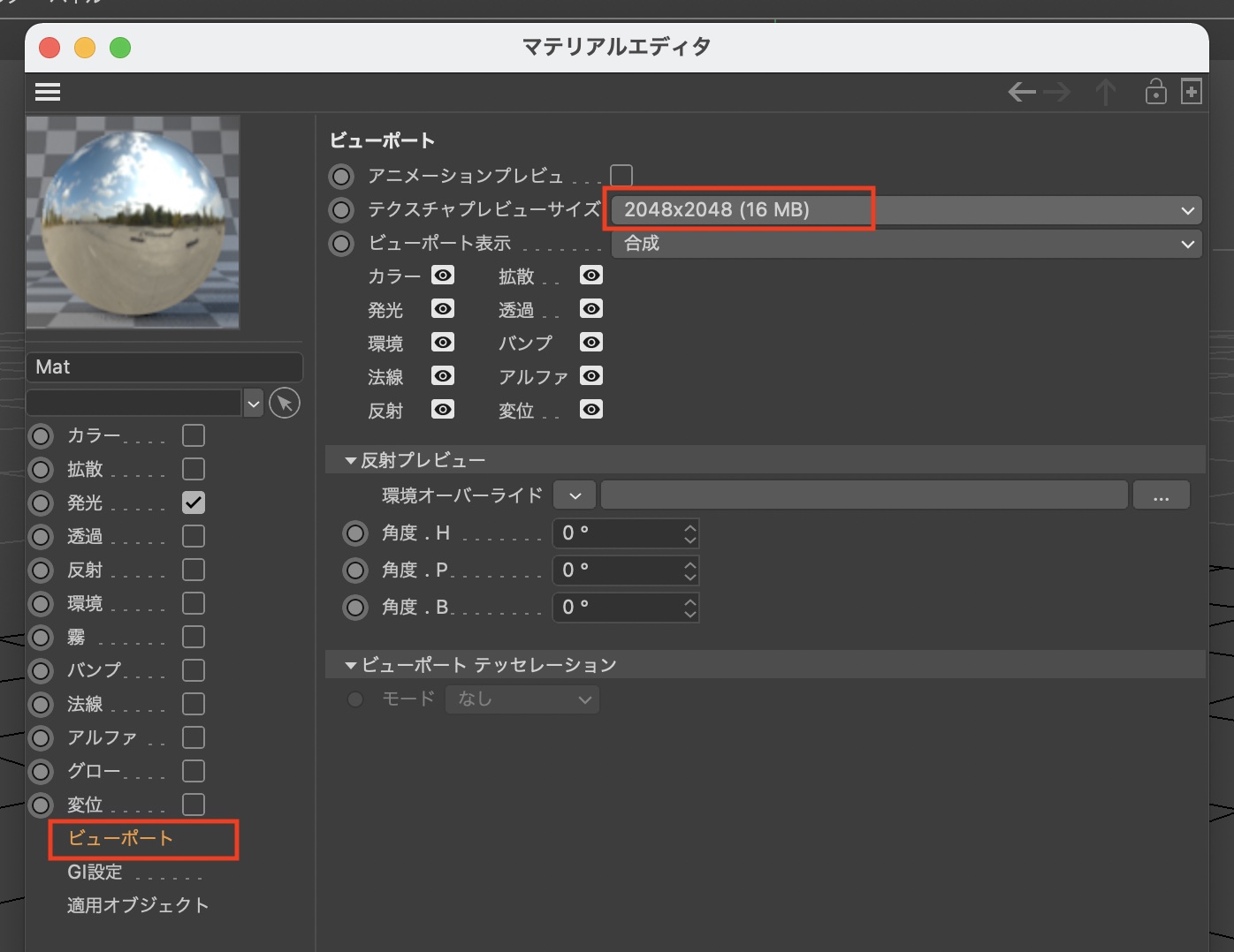また、必要に応じて「ビューポート」の項目にある「テクスチャプレビューサイズ」からHDRIの解像度に合わせてサイズを変更すると良いでしょう。筆者の場合は2Kの素材なので、サイズを「2048x2048」にしました。