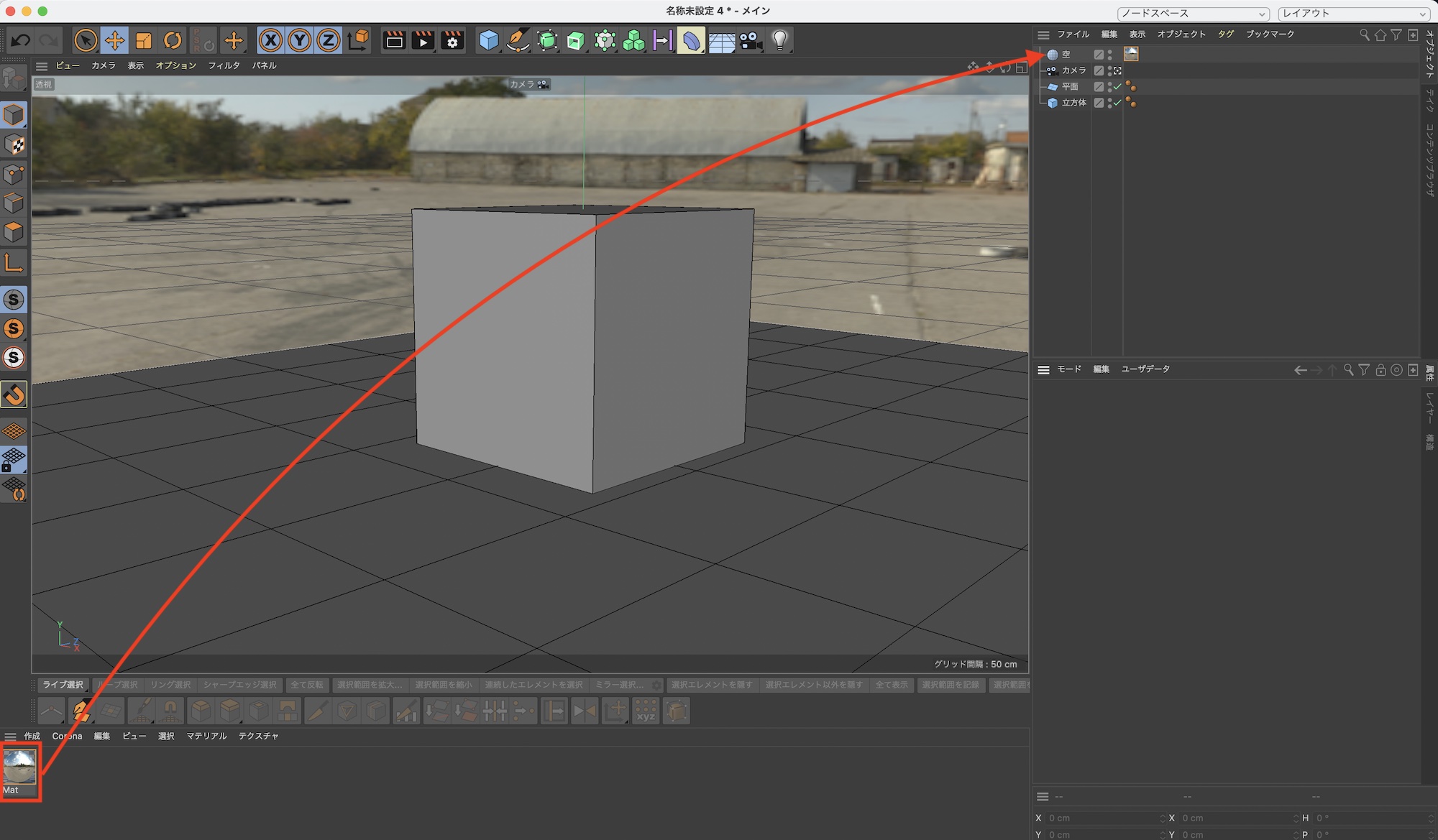 HDRIが追加されているマテリアルを「空」にドラッグしマテリアルを適用させればプロジェクトにHDRIが適用されます。