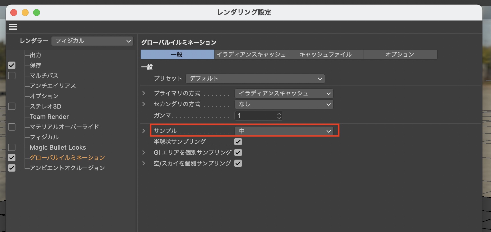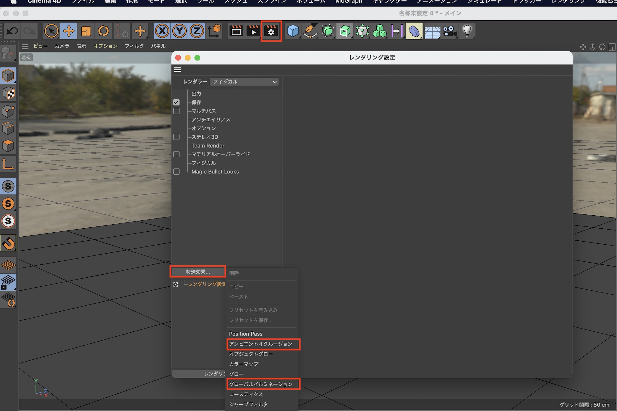 上部ツールバーにあるCinema 4Dのレンダリング設定を開き、「特殊効果」をクリックして「グローバルイルミネーション」と「アンビエントオクルージョン」をクリックして追加します。
