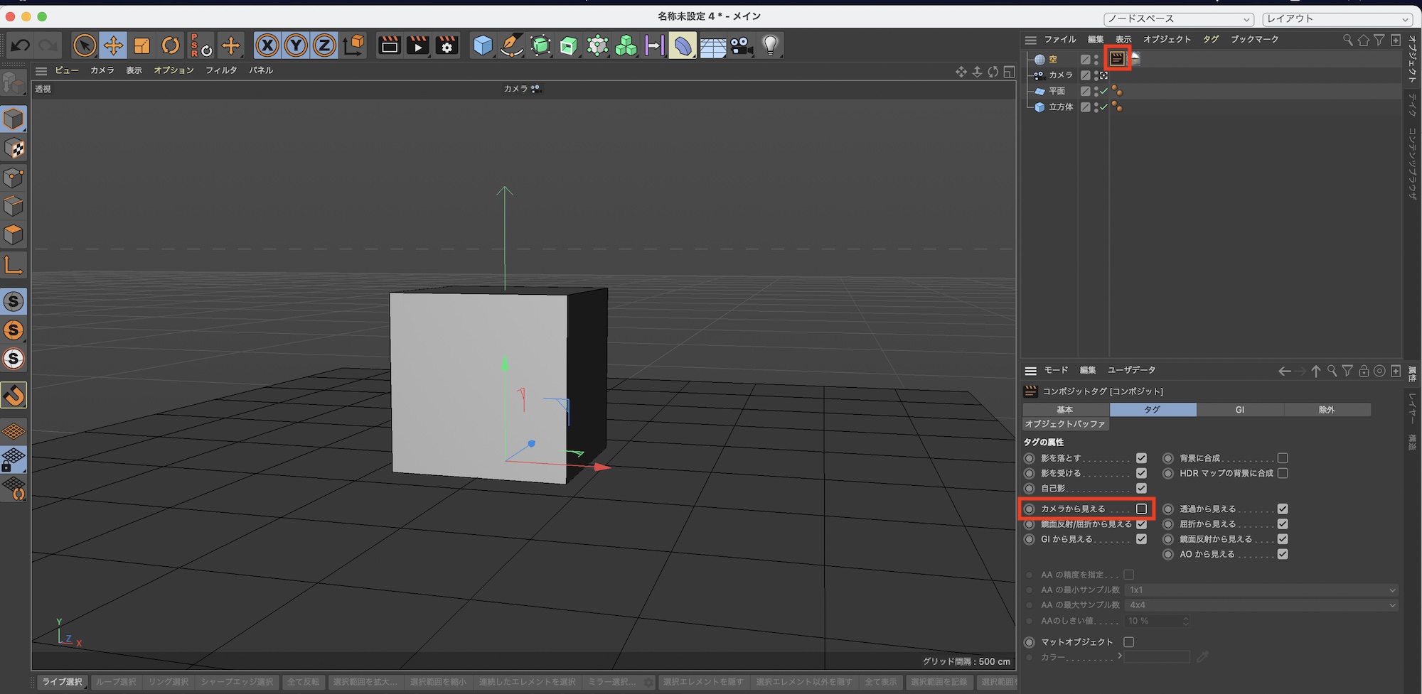 コンポジットタグをクリックして「タグ」の項目から「カメラから見える」のチェックを外せば画像を非表示にすることが出来ます。