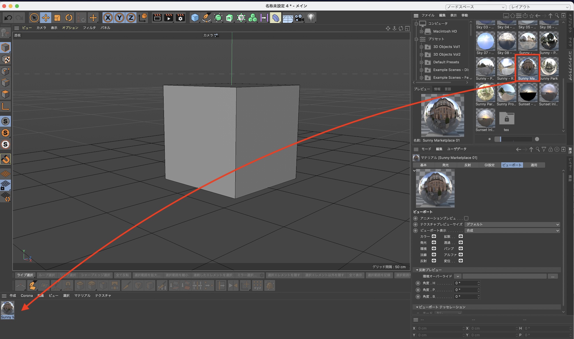 HDRIは屋外、街中、スタジオなど様々あるので、シーンに最適なHDRIをダブルクリックするか、マテリアルマネージャにドラッグ&ドロップします。Cinema 4Dのプリセットを読み込んだ場合、自動でマテリアルとして適用されています。