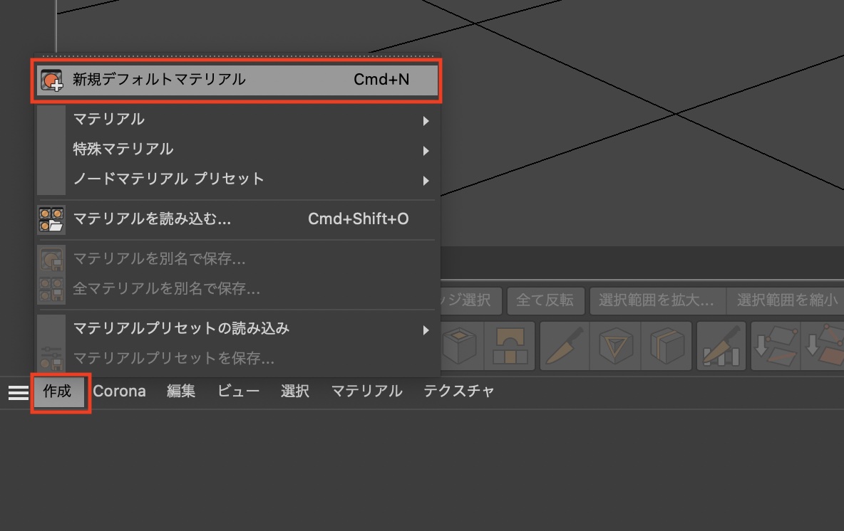 HDRIHavenなどで入手したHDRIを適用させるにはマテリアルマネージャをダブルクリックまたは「作成」、「新規デフォルトマテリアル」をクリックし、マテリアルを追加します。