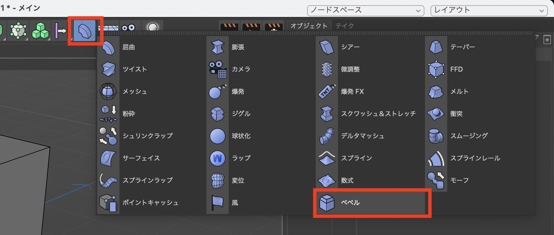 上部メニューにあるデフォーマの一覧から「ベベル」を追加します。