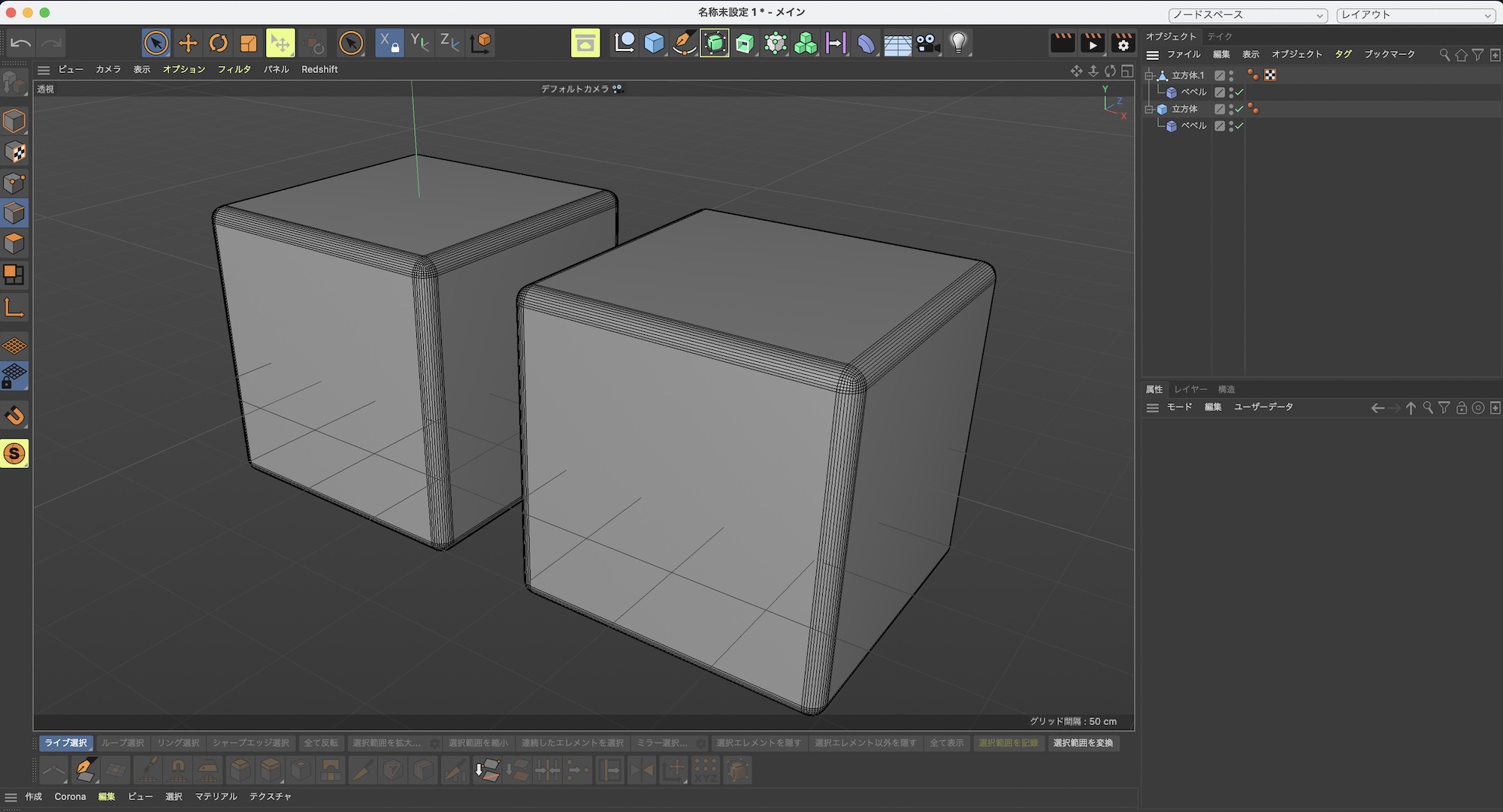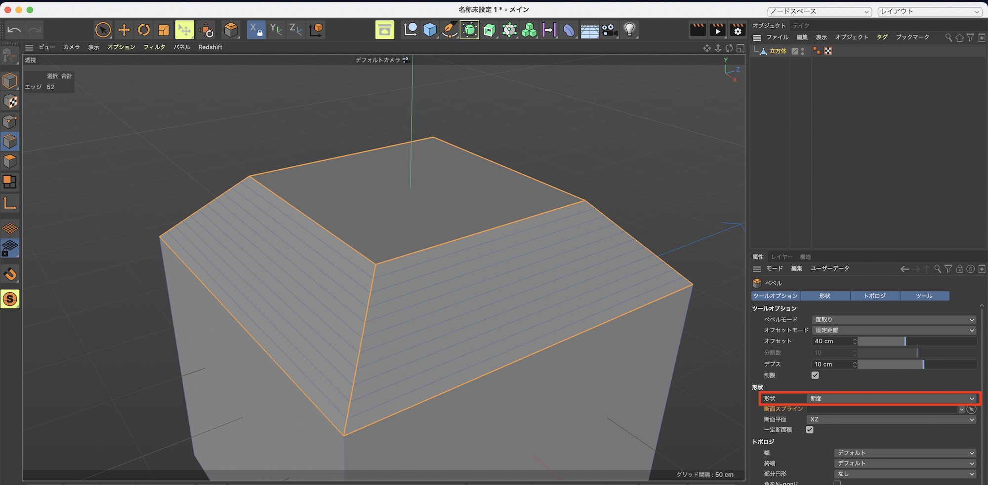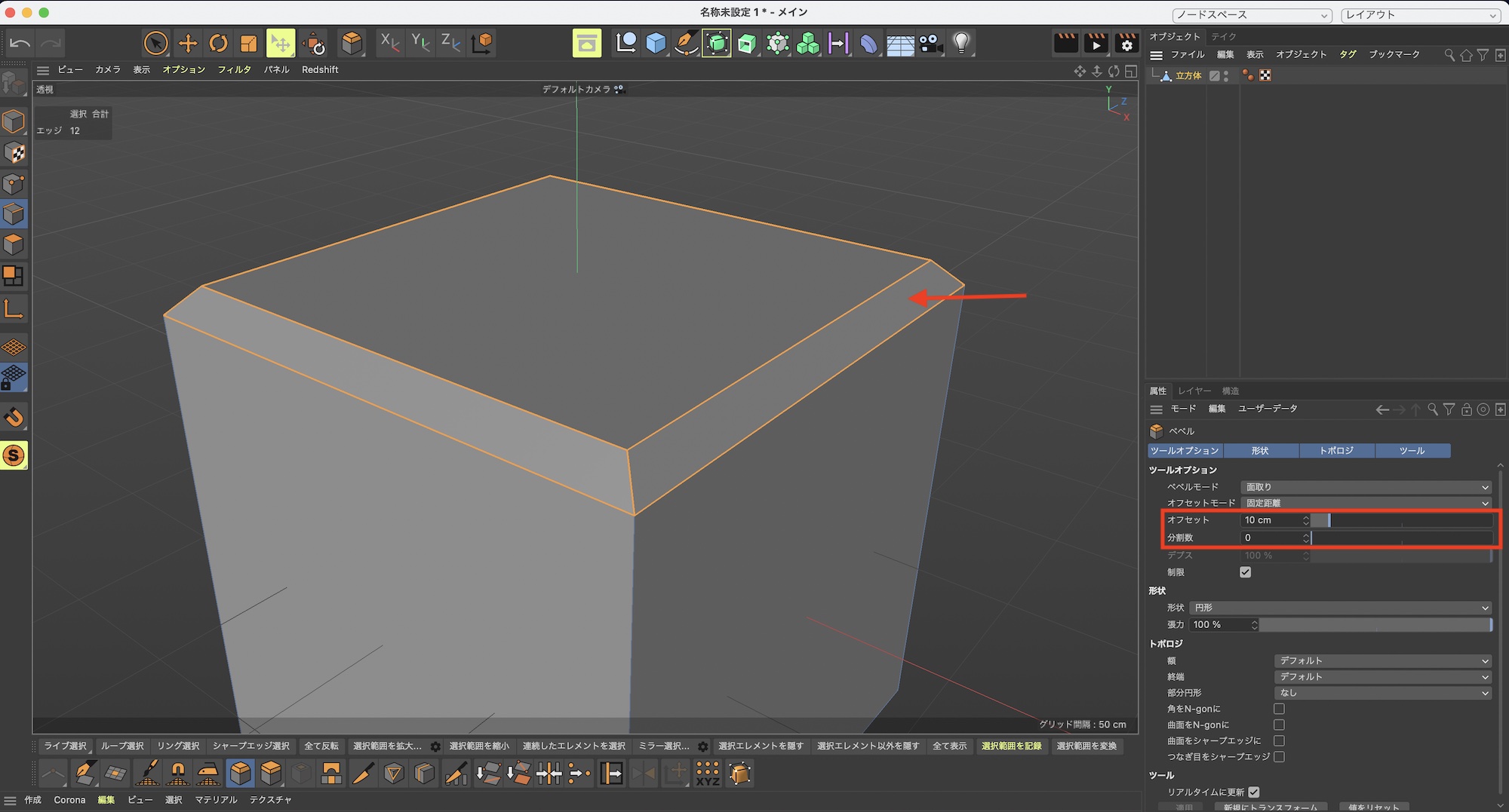 その状態で左クリックしながらマウスを左右にドラッグするか、属性マネージャの項目から「オフセット」と「分割数」の数値を入力してベベルを適用させます。デフォルトの設定は「オフセット:10cm」、「分割数:0」となっており、上のような感じになります。