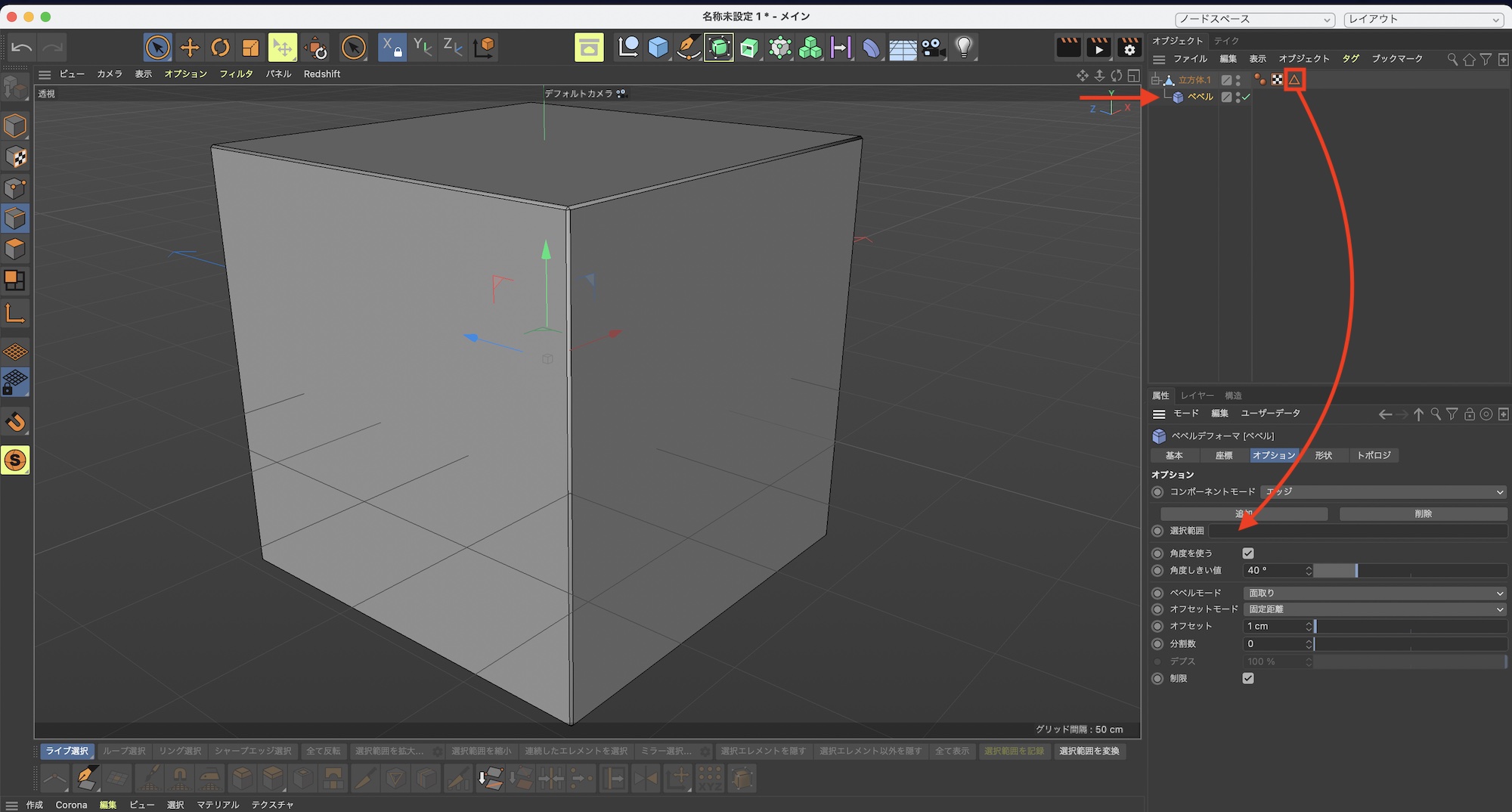 ベベルデフォーマはオブジェクトを編集可能にせずとも利用できますが、特定のエッジにベベルを適用させる場合はオブジェクトを編集可能にする必要があるので、基本的にオブジェクトを変換し、ある程度のモデリングを完了した最後のステップとしてベベルを追加することをオススメします。