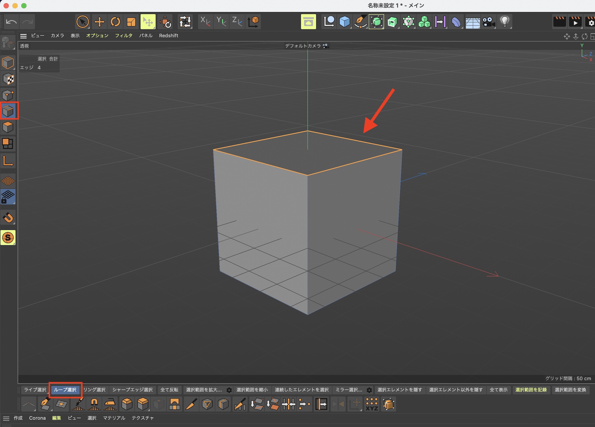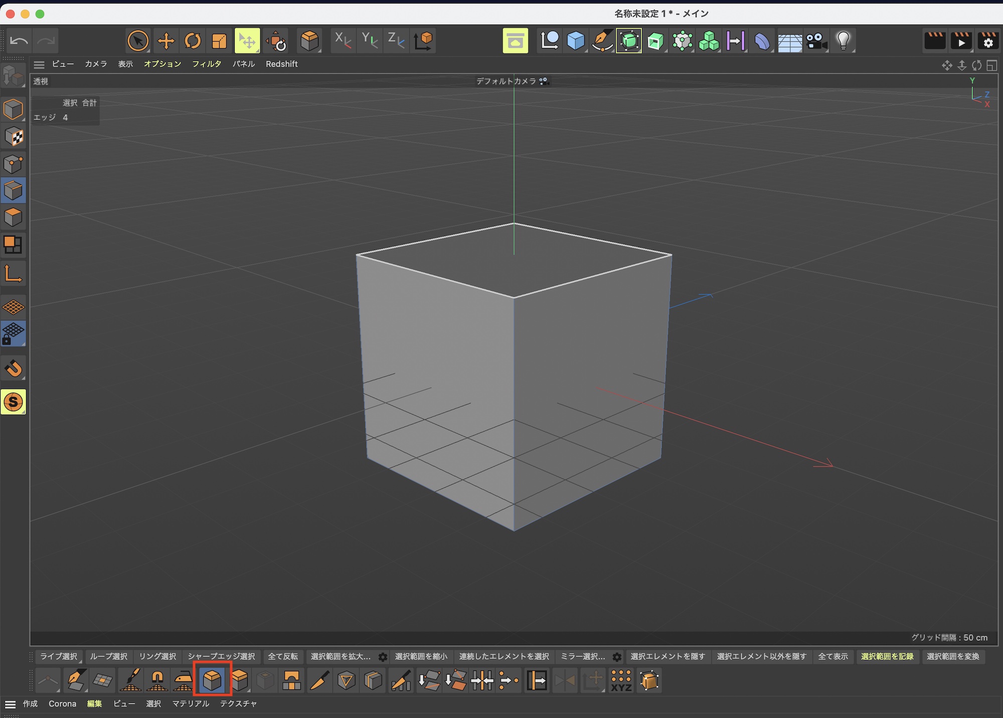 エッジモードにして、ベベルを追加したいエッジを選択しましょう。今回筆者はループ選択ツール(ショートカット: U+Lキー)を使用して、立方体上部の4つのエッジを選択しました。