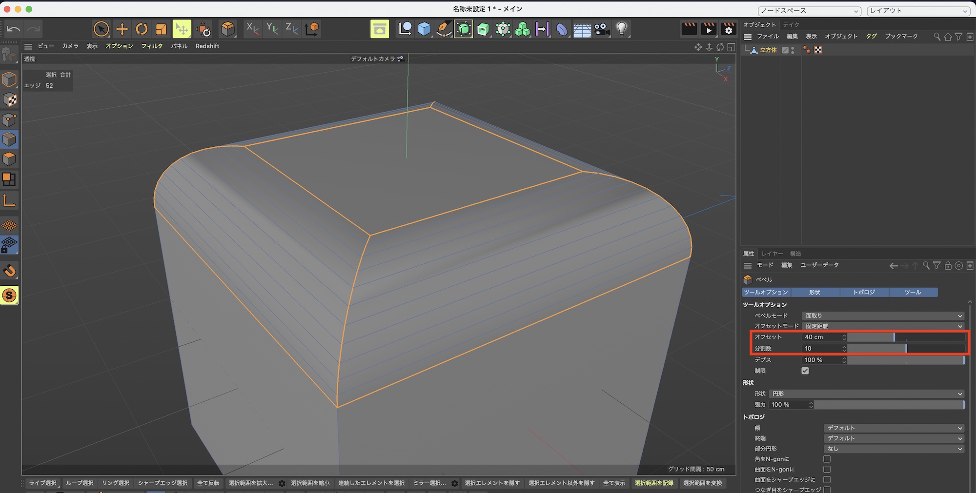 「オフセット」はベベルの深さを指定するもので、「分割数」は作成されたベベルを何分割するかを指定できます。上の例ではオフセット:40cm、分割数:10にしたことで丸みのある深めのベベルが出来ました。