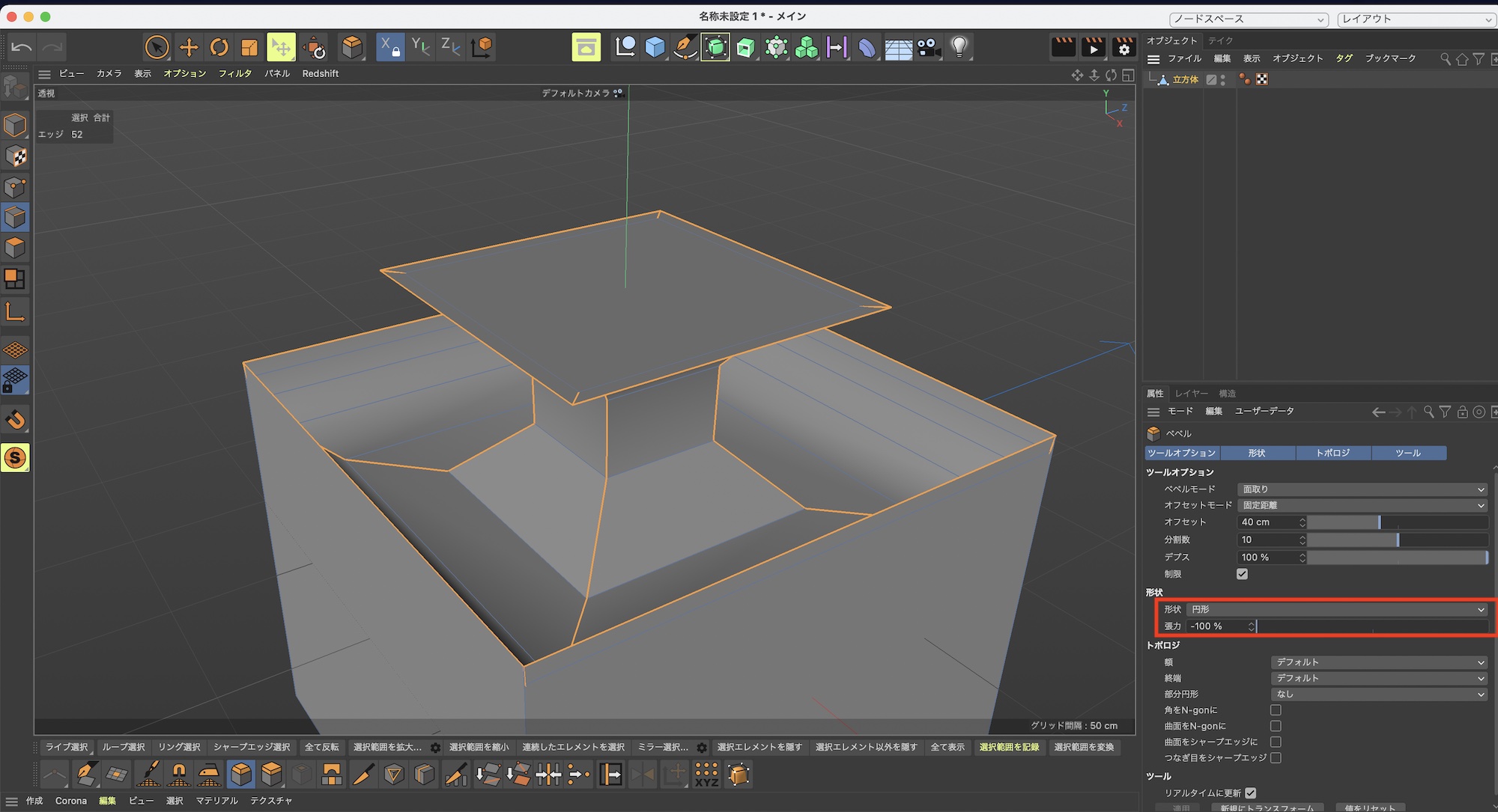 基本的にこのベベルはマウスを使って操作するのが楽なので、「分割数」の数値のみ変更すれば問題ありませんが、「形状」の項目でザクッと切ったような「断面」にしたり、「形状:円形」にして「強力:-100%」にしてベベルの効果を反転することも出来ます。