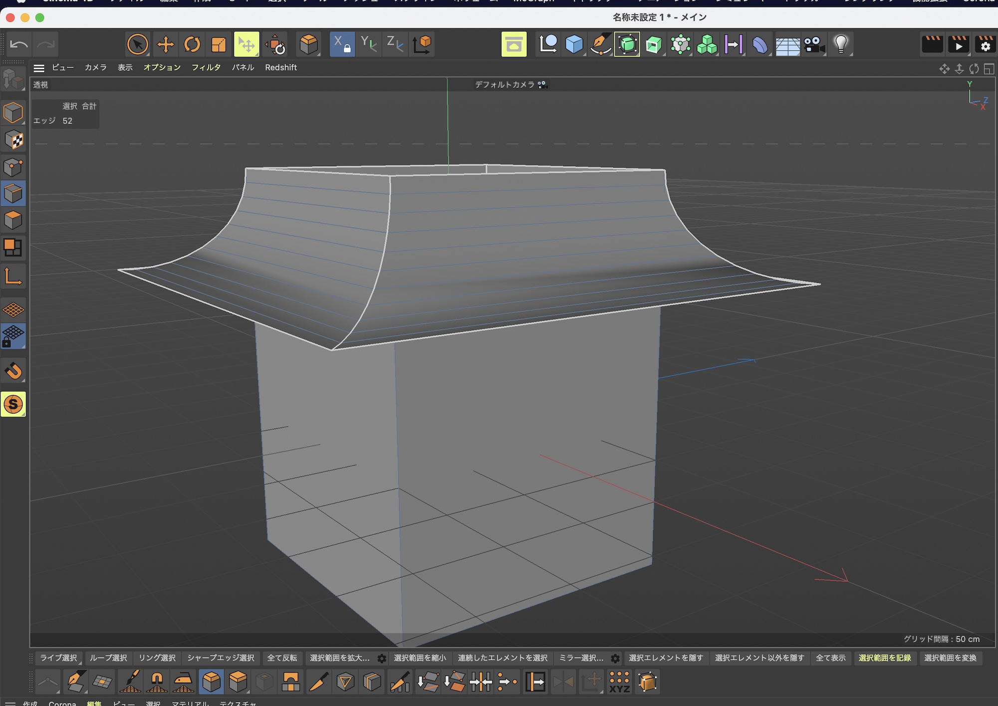 また、マウス操作で反対側にドラッグすると屋根のような形状を作り出すことも出来るので、属性マネージャの設定やマウスを使って理想なベベルを作成してみてください。