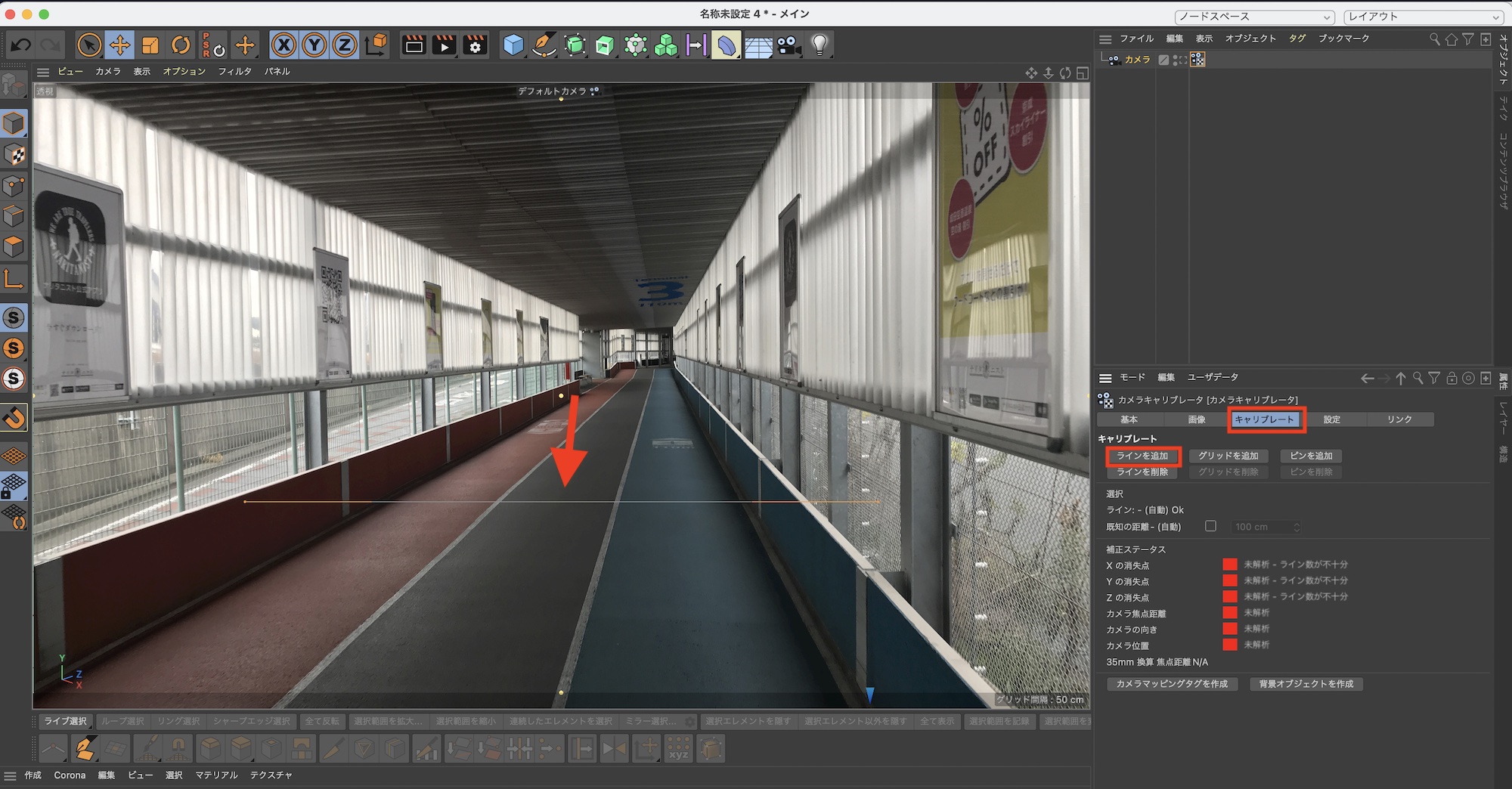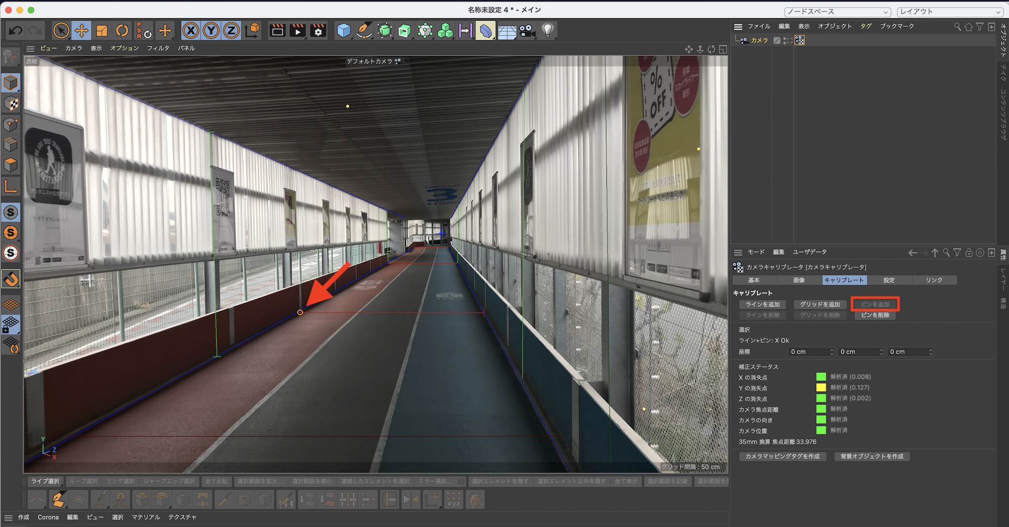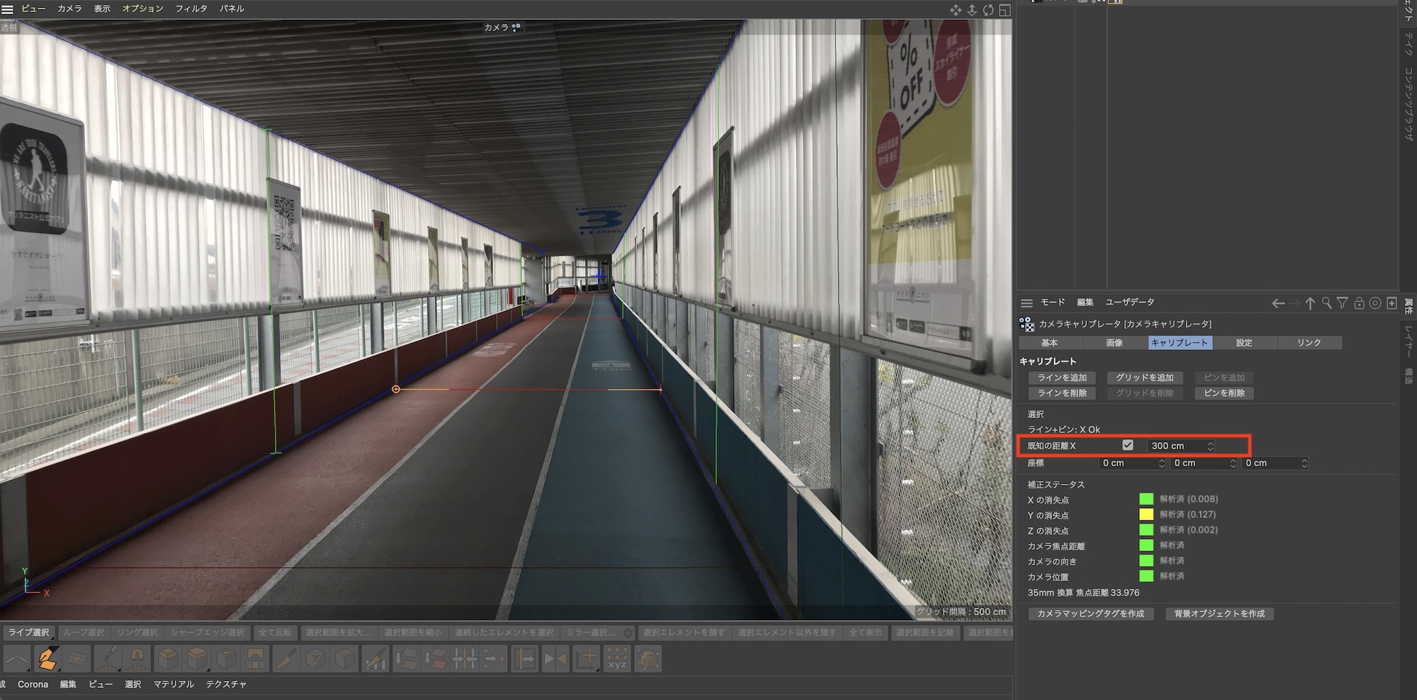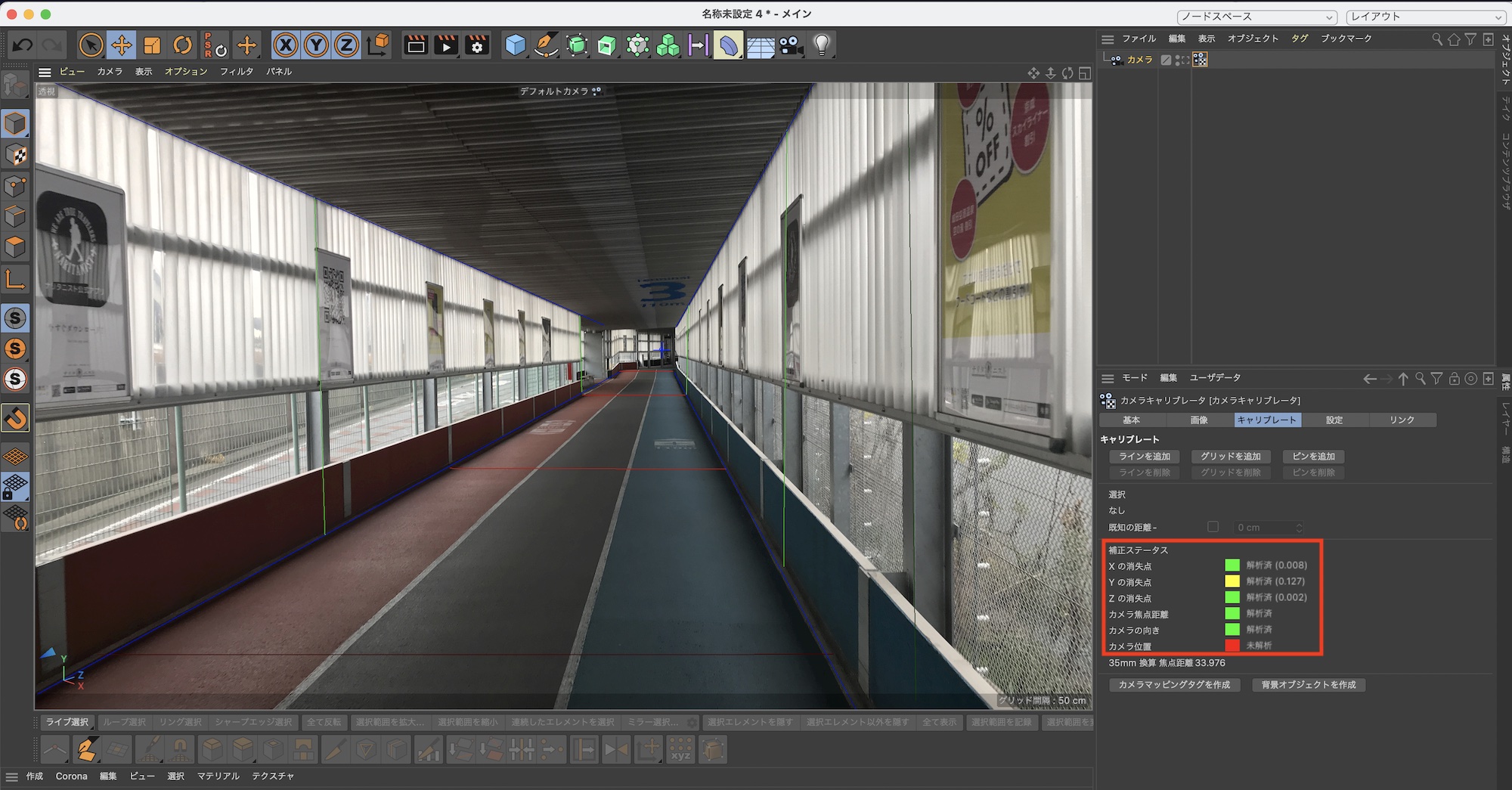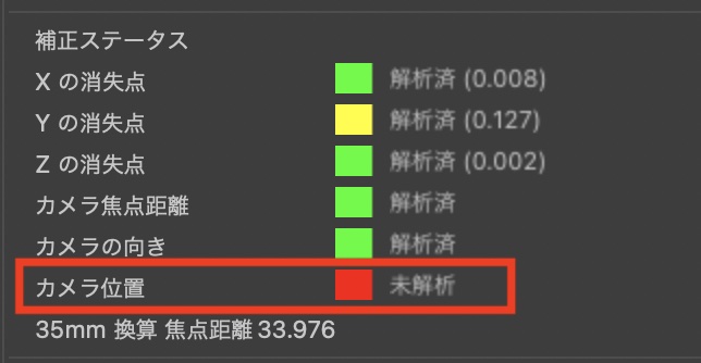 続けてY軸とZ軸のラインを追加していきます。写真の柱などを参考にラインを追加していくと良いでしょう。最終的に筆者はXZとカメラの焦点距離、向きは解決済みとなり、Yの消失点は黄色のステータスですが、解決済みという感じにキャリブレートしました。