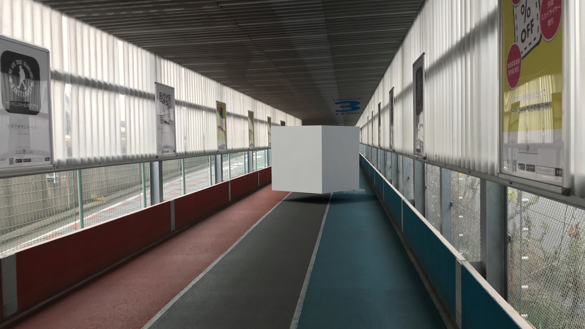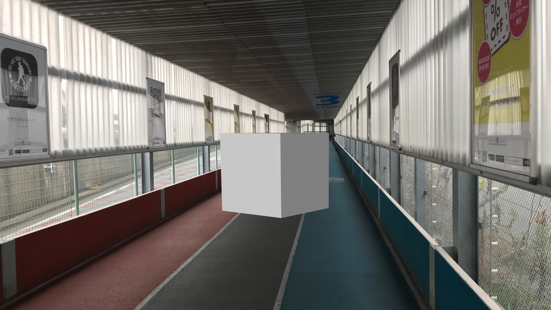 上の例では立方体を付け加えたもの。オブジェクトと背景の画像の位置はいい感じに調整されていますが、オブジェクトの影がなかったり光が不自然だったりするので、合成する写真に合わせて床や光源などのオブジェクトをさらに追加する必要があります。