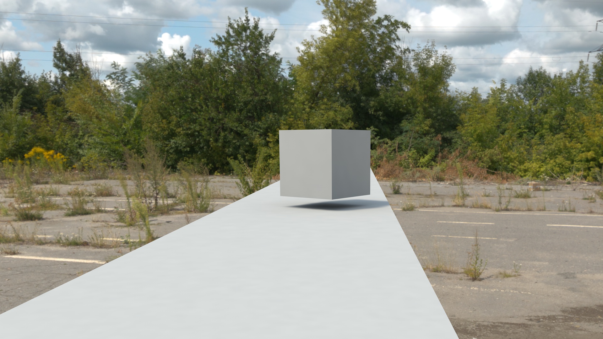 今回は追加で平面を立方体の下に配置し、空オブジェクトにHDRIのマテリアルを適用してみました。この状態でレンダリングしたものがこちら。