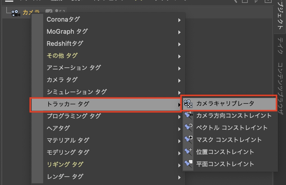カメラオブジェクトを右クリックし、「トラッカータグ」から「カメラキャリブレーター」をクリックしましょう。