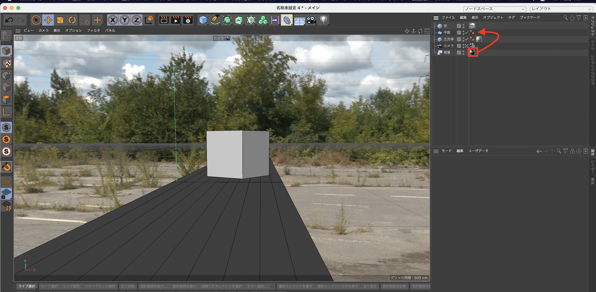 まず、平面のオブジェクトに背景オブジェクトで使われたマテリアルを「Control(Command)」キーを押しながら、平面オブジェクトにドラッグ・アンド・ドロップします。