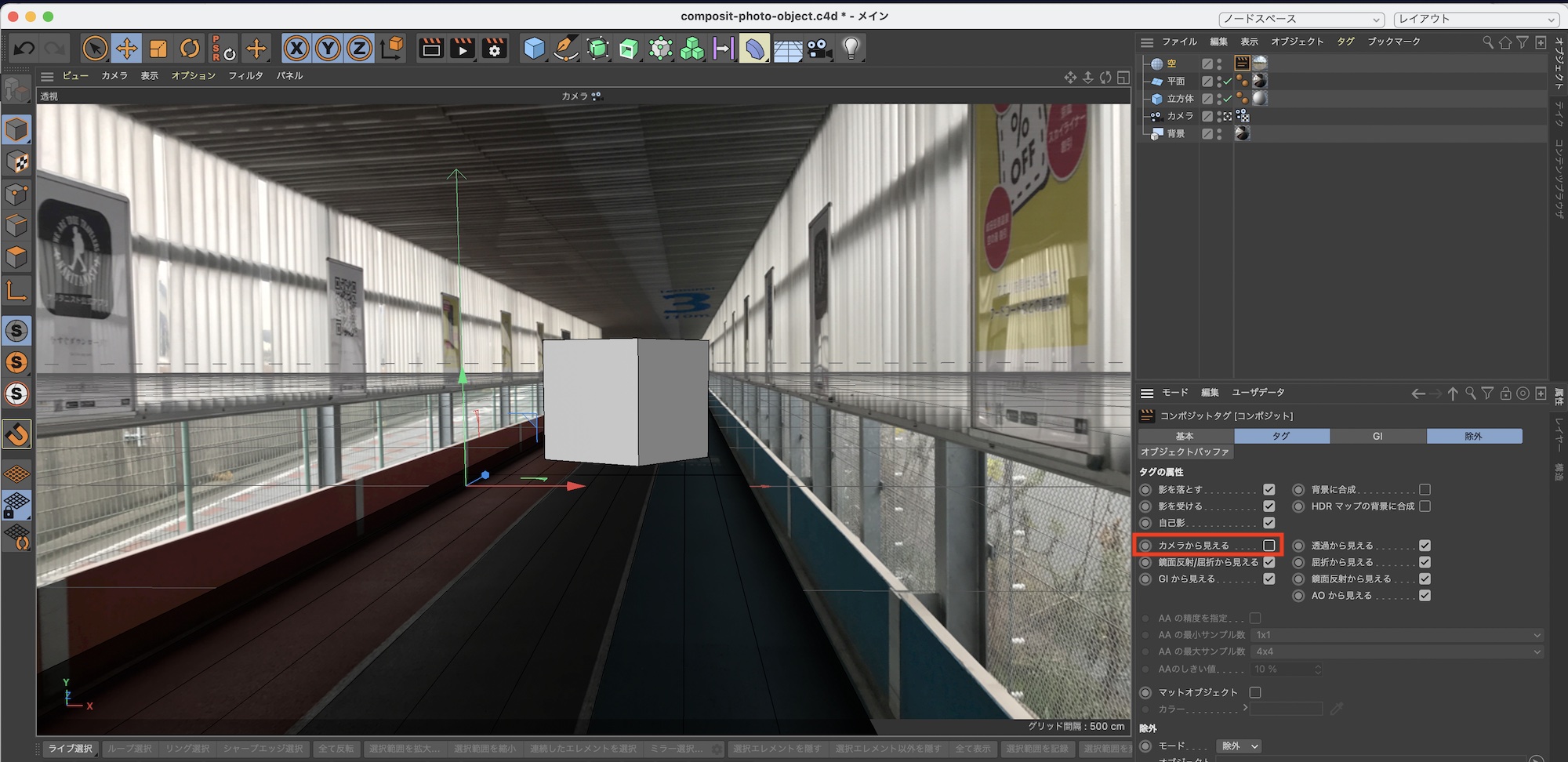 コンポジットタグを選択して、「タグ」の項目から「カメラから見える」のチェックを外せば元の背景が表示されるようになります。下はその状態でレンダリングされたもの。