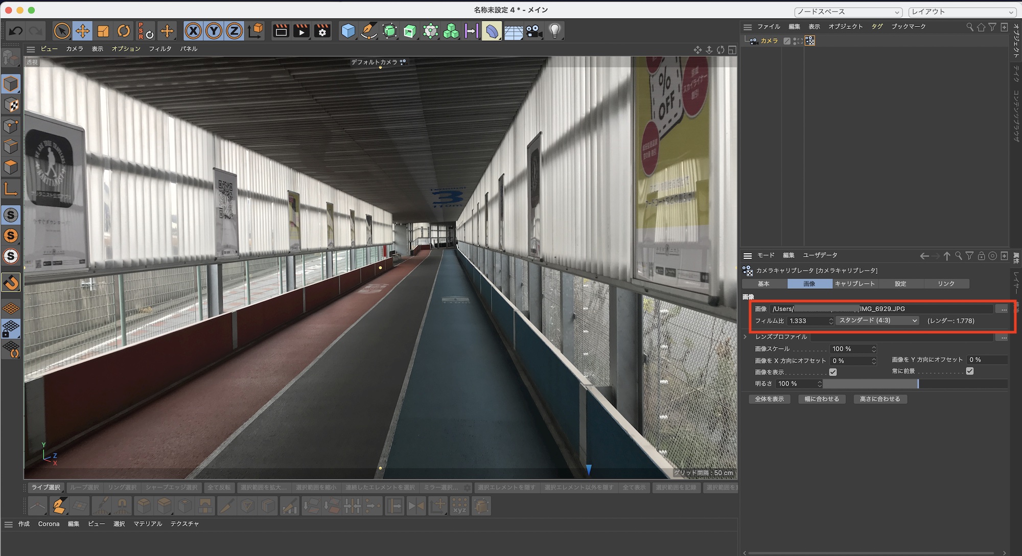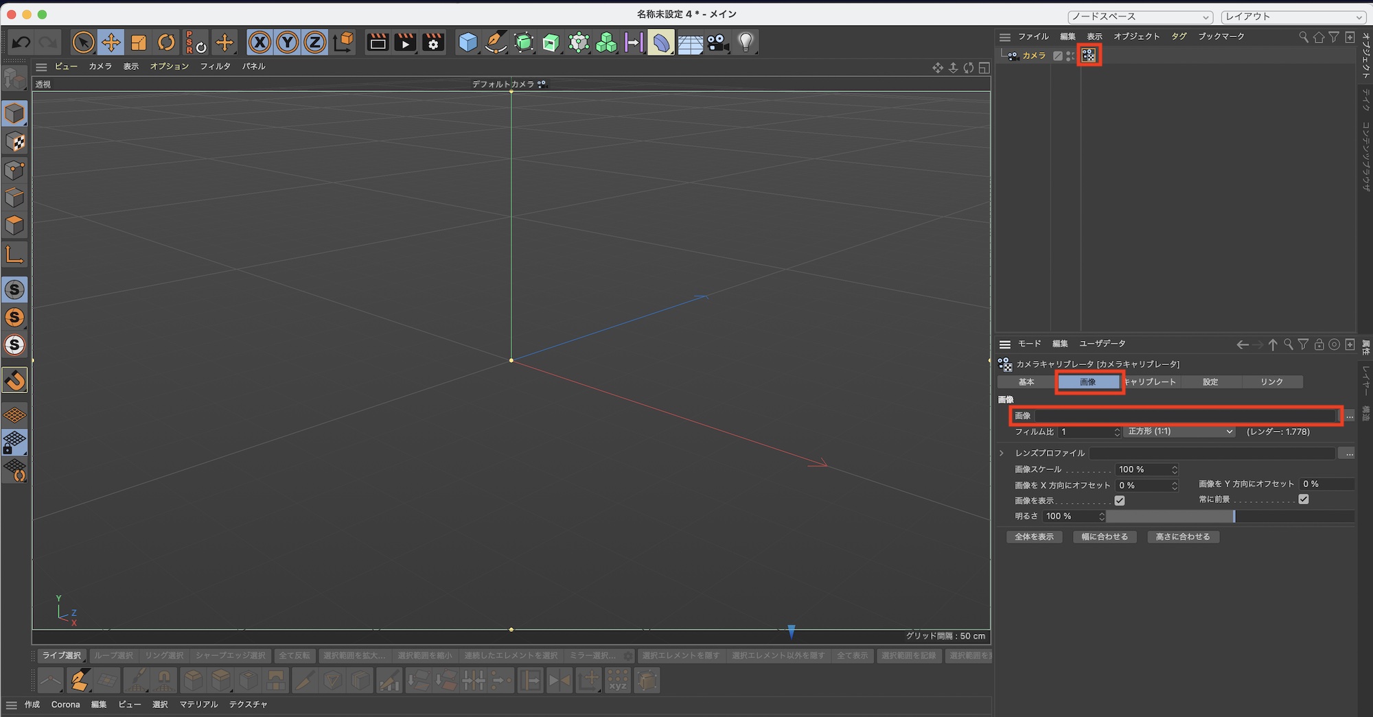 カメラキャリブレータータグをクリックし、属性マネージャの「画像」の項目から、合成したい画像をドラッグ・アンド・ドロップして追加します。