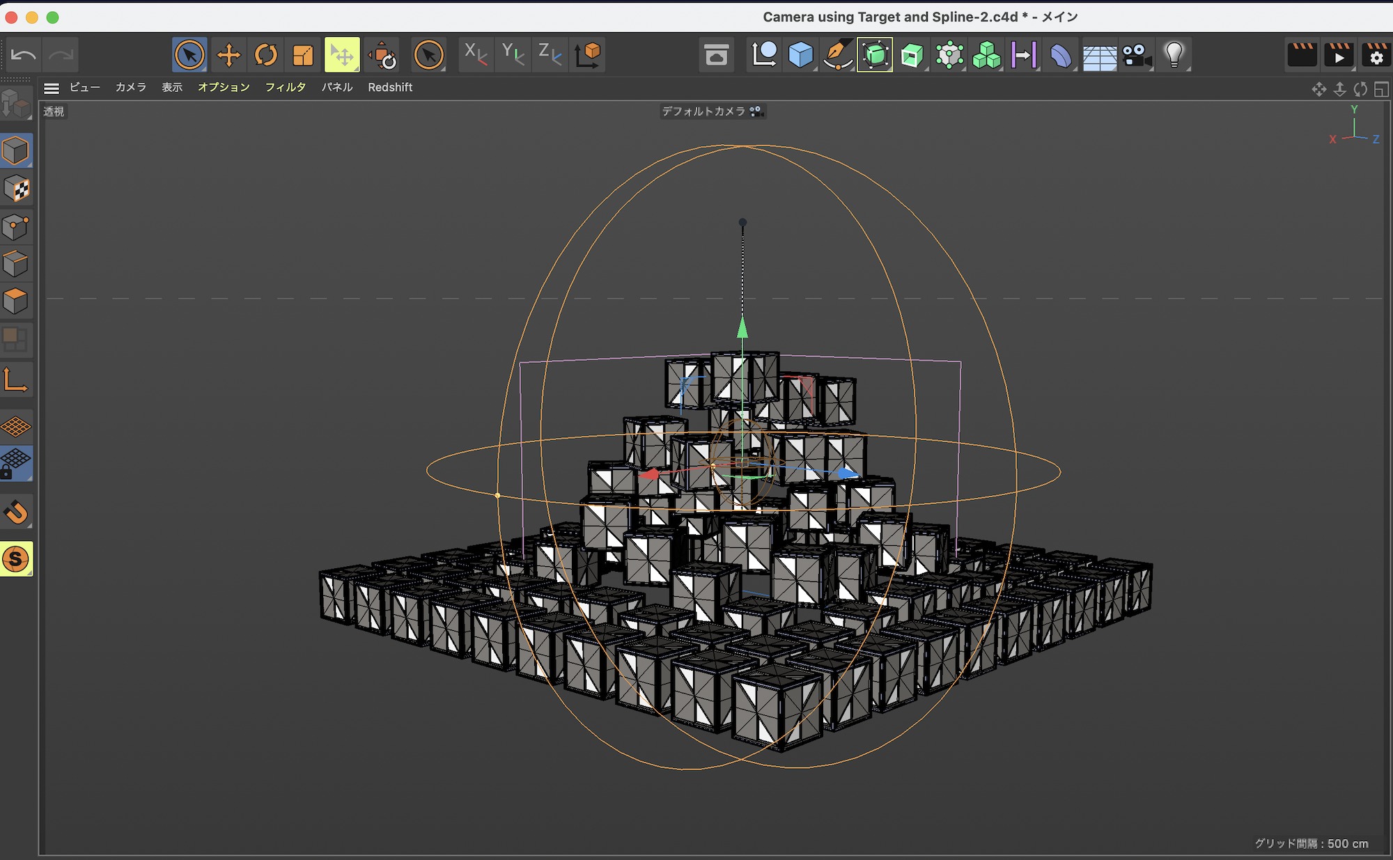 「ターゲットタグとスプラインを活用して、被写体を固定してカメラの動きを作成する方法とは?」の記事と同じようにオブジェクトの周りをカメラが動くようなショットを作成したいので、カメラオブジェクトとスプラインを追加します。