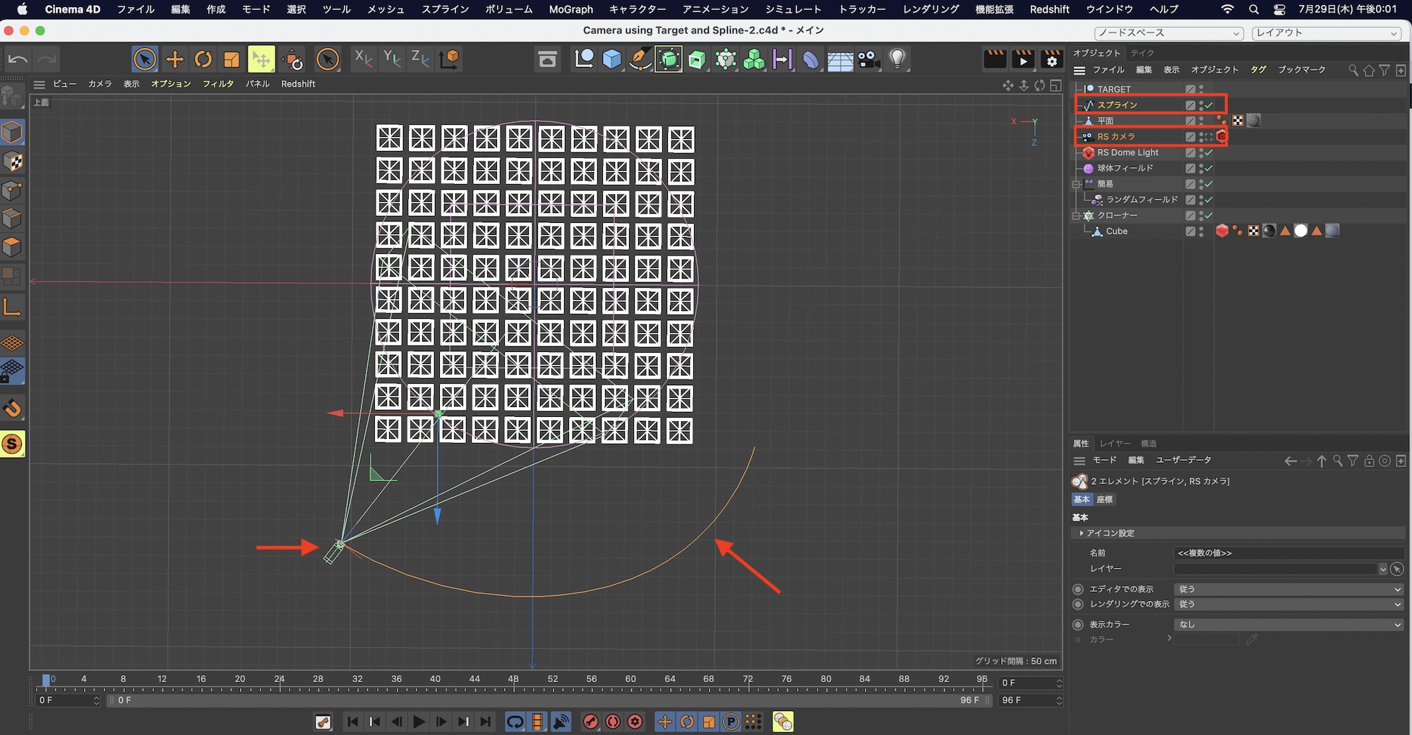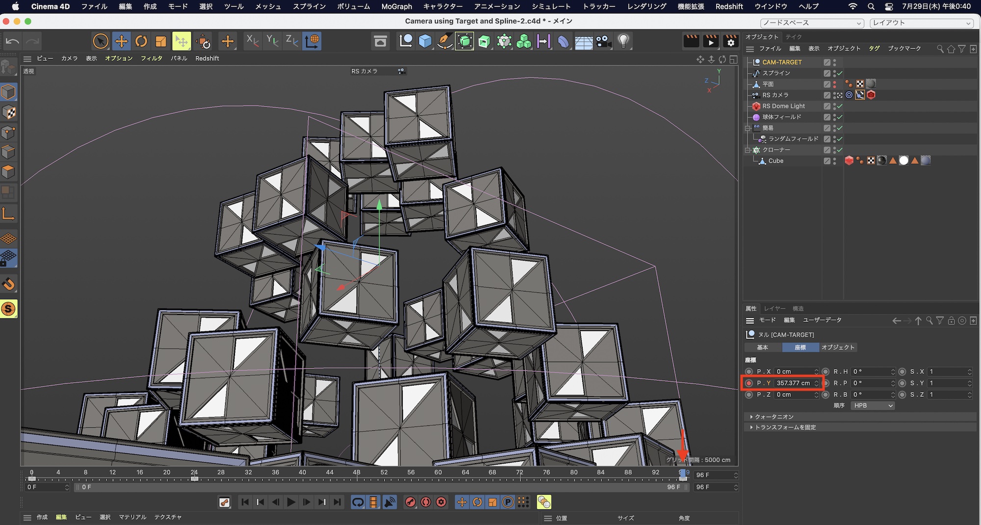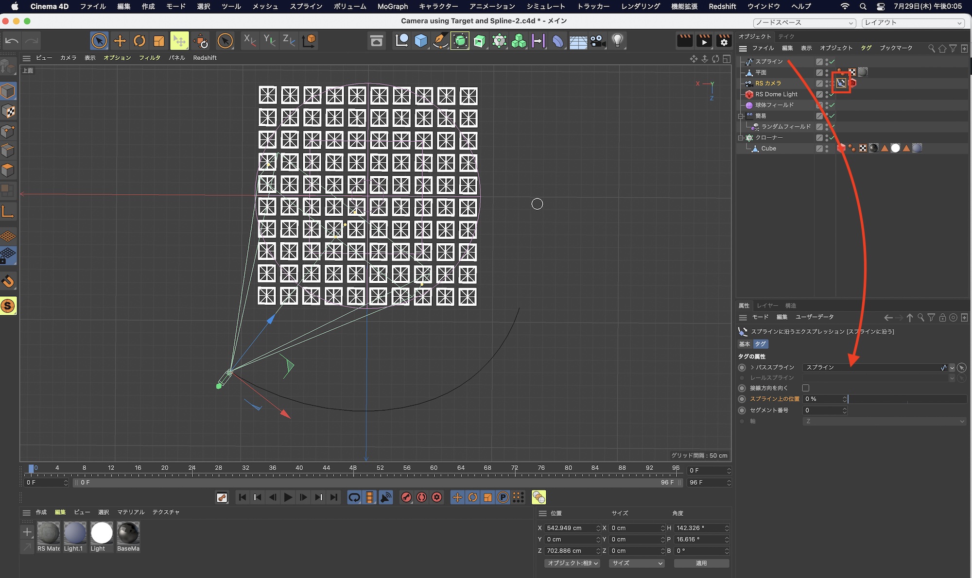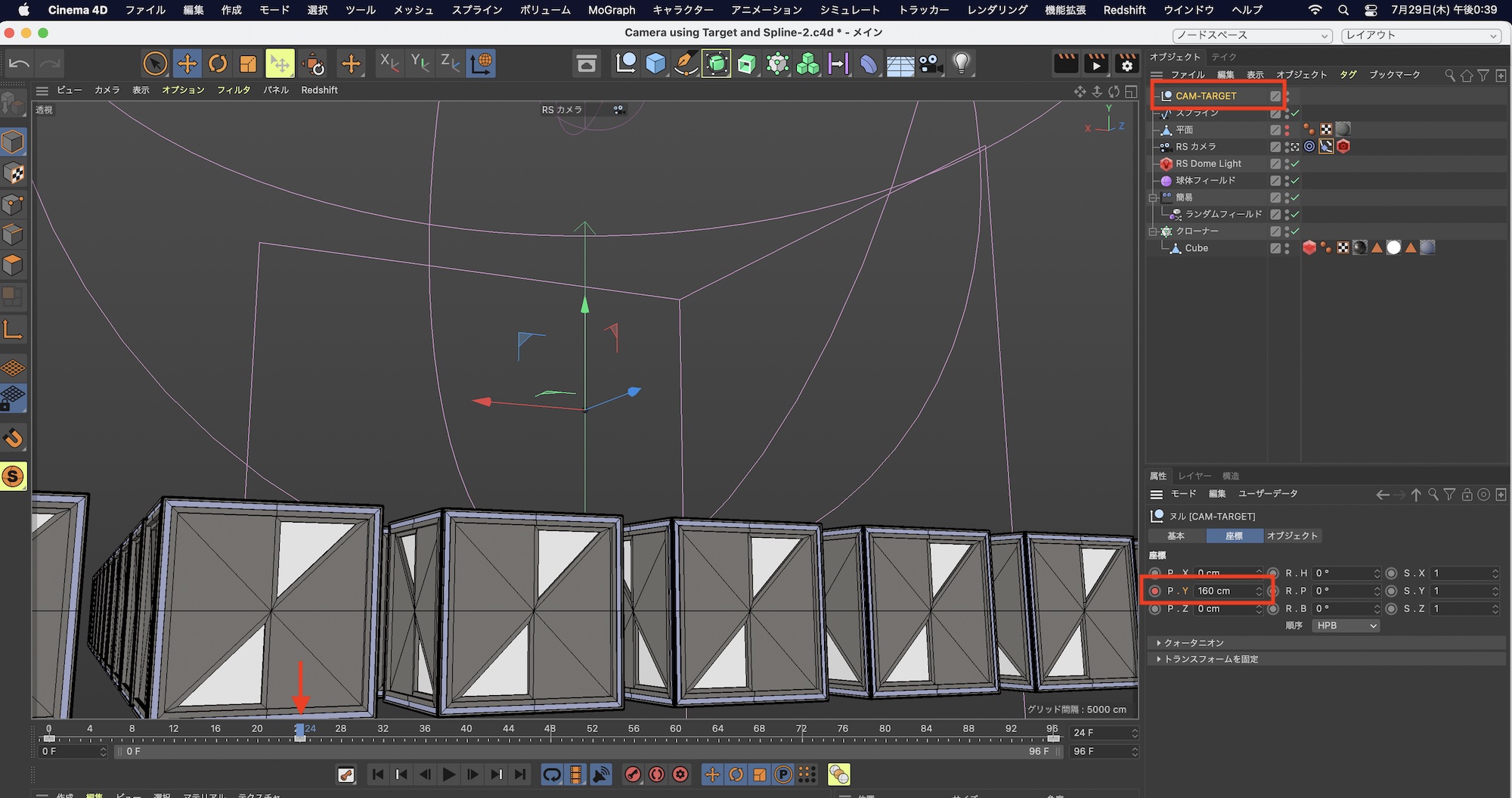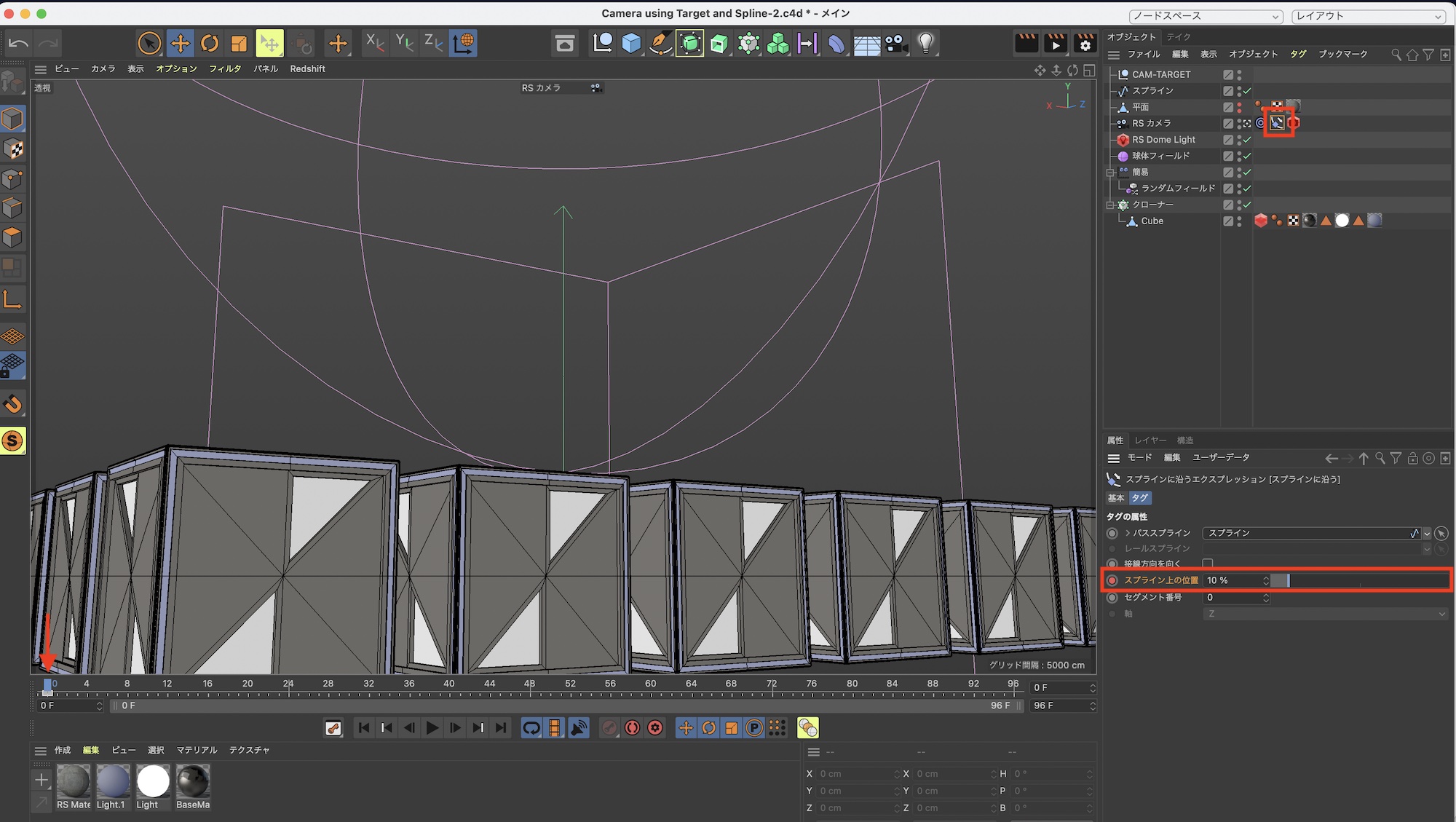 筆者のプロジェクトではRedshiftのRSカメラを使用していますが、Cinema 4Dのカメラオブジェクトを使っても同じ操作で行なえます。
