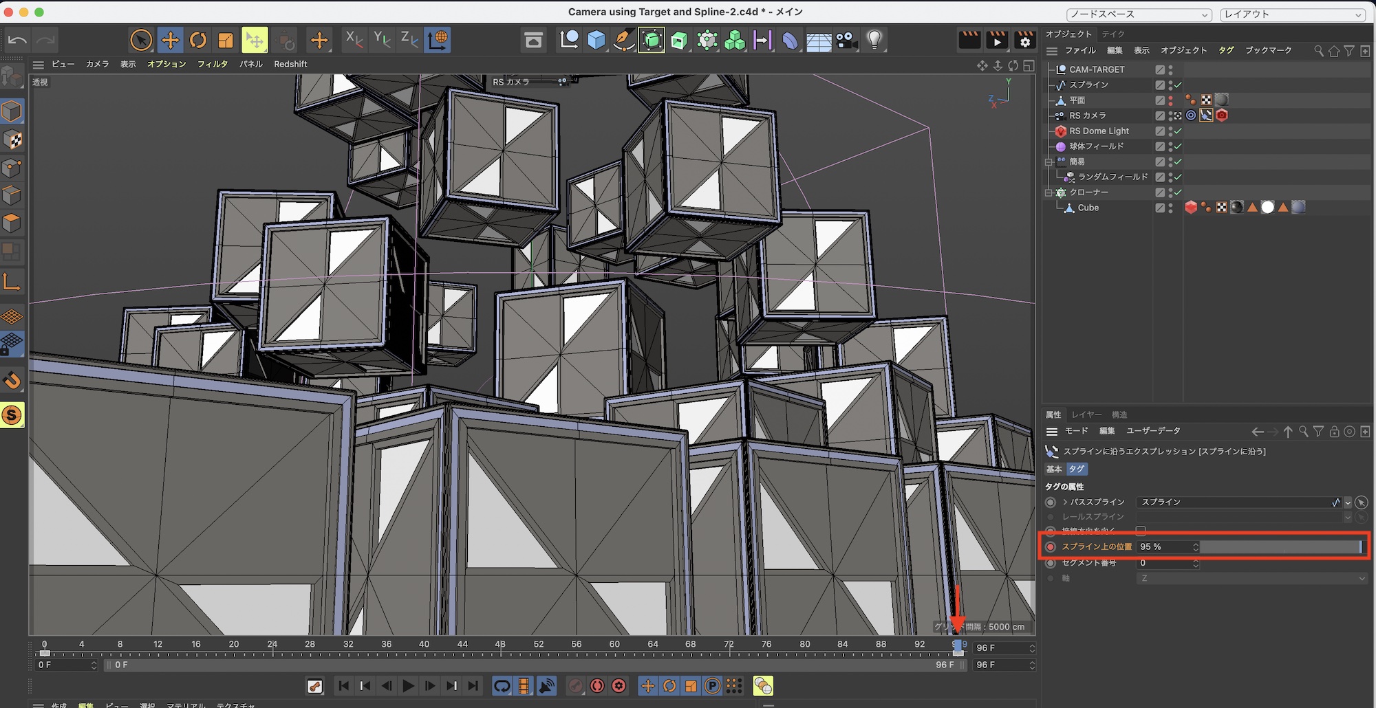 次にタイムインジケータを動かして次のキーフレームを追加します。筆者の場合は96フレームのシーンなので、「96F」のタイミングで「スプライン上の位置」を「95%」に指定しました。