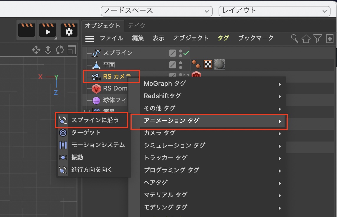 カメラオブジェクトを選択して右クリック「アニメーションタグ」から「スプラインに沿う」を選択し、スプラインに沿うタグの「パススプライン」に作成したスプラインをドラッグ・アンド・ドロップしましょう。