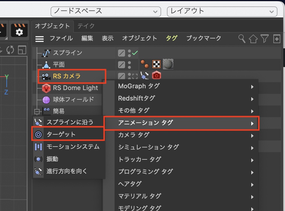 カメラオブジェクトを右クリック、「アニメーションタグ」から「ターゲット」を追加します。
