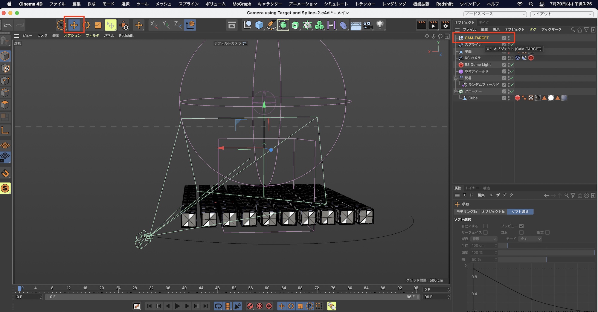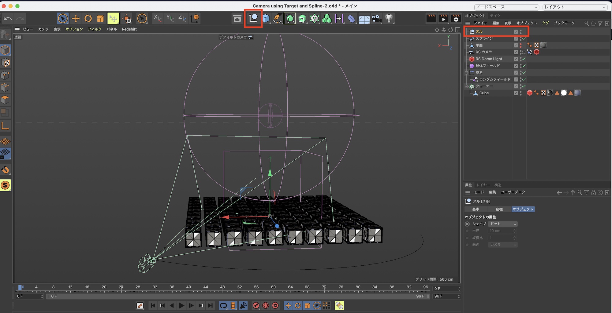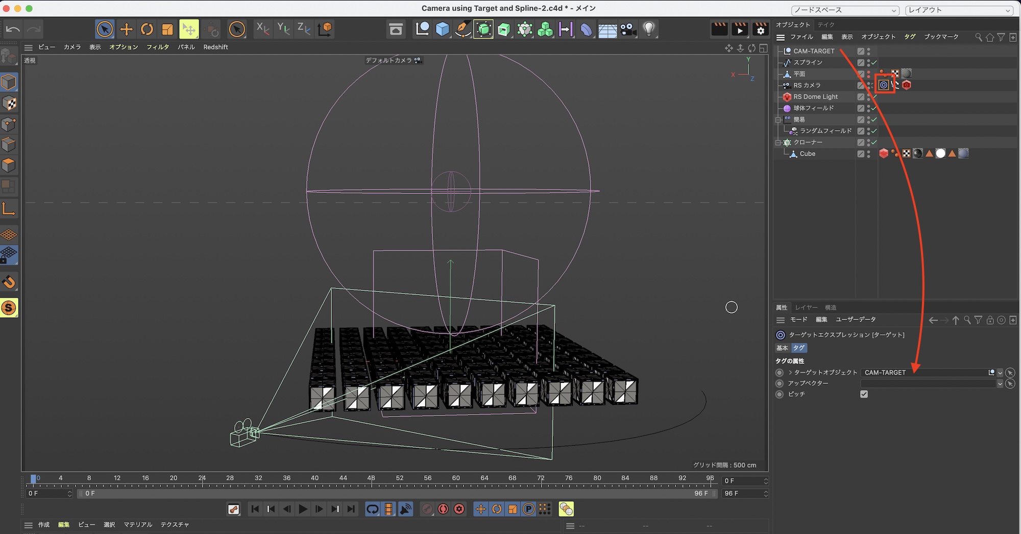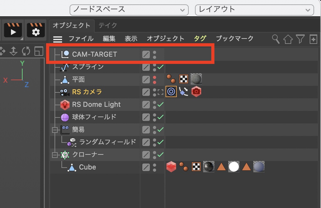 カメラオブジェクトに追加されたターゲットタグをクリックし、属性マネージャ内の「ターゲットオブジェクト」に先ほど追加したヌルオブジェクト、「CAM-TARGET」をドラッグ・アンド・ドロップします。