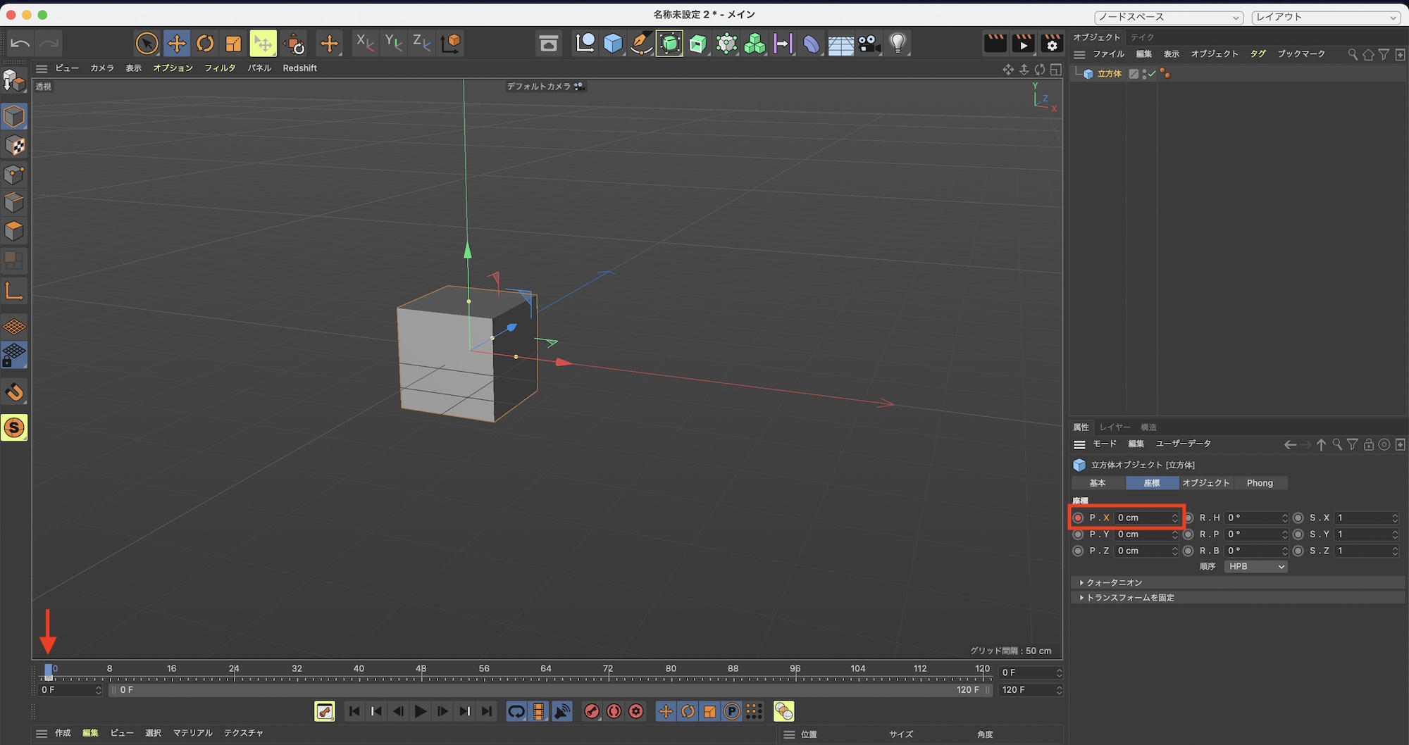 立方体を選択して、属性マネージャの「座標」内にある「P.X」の左側にある円形のキーフレームアイコンをクリックします。
