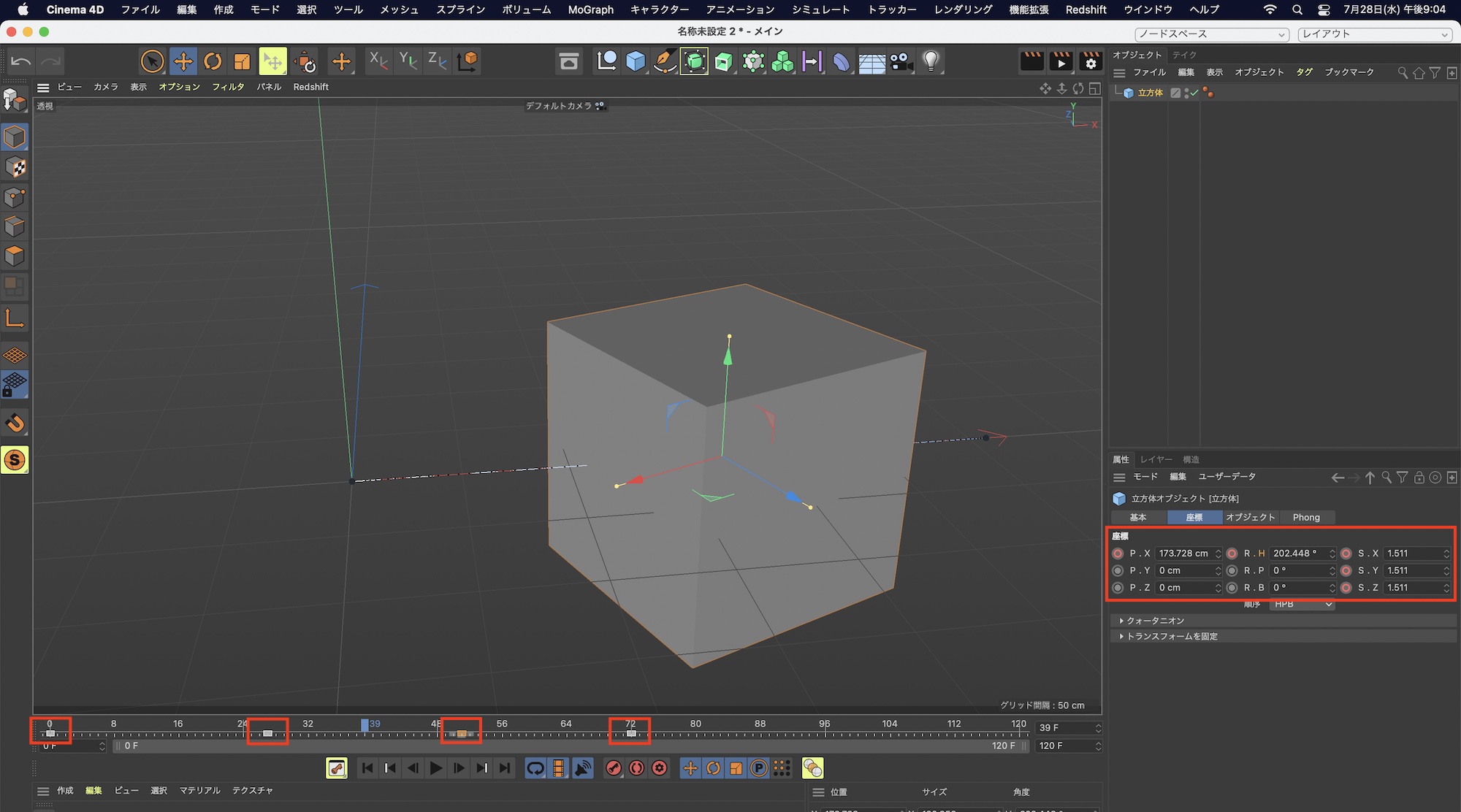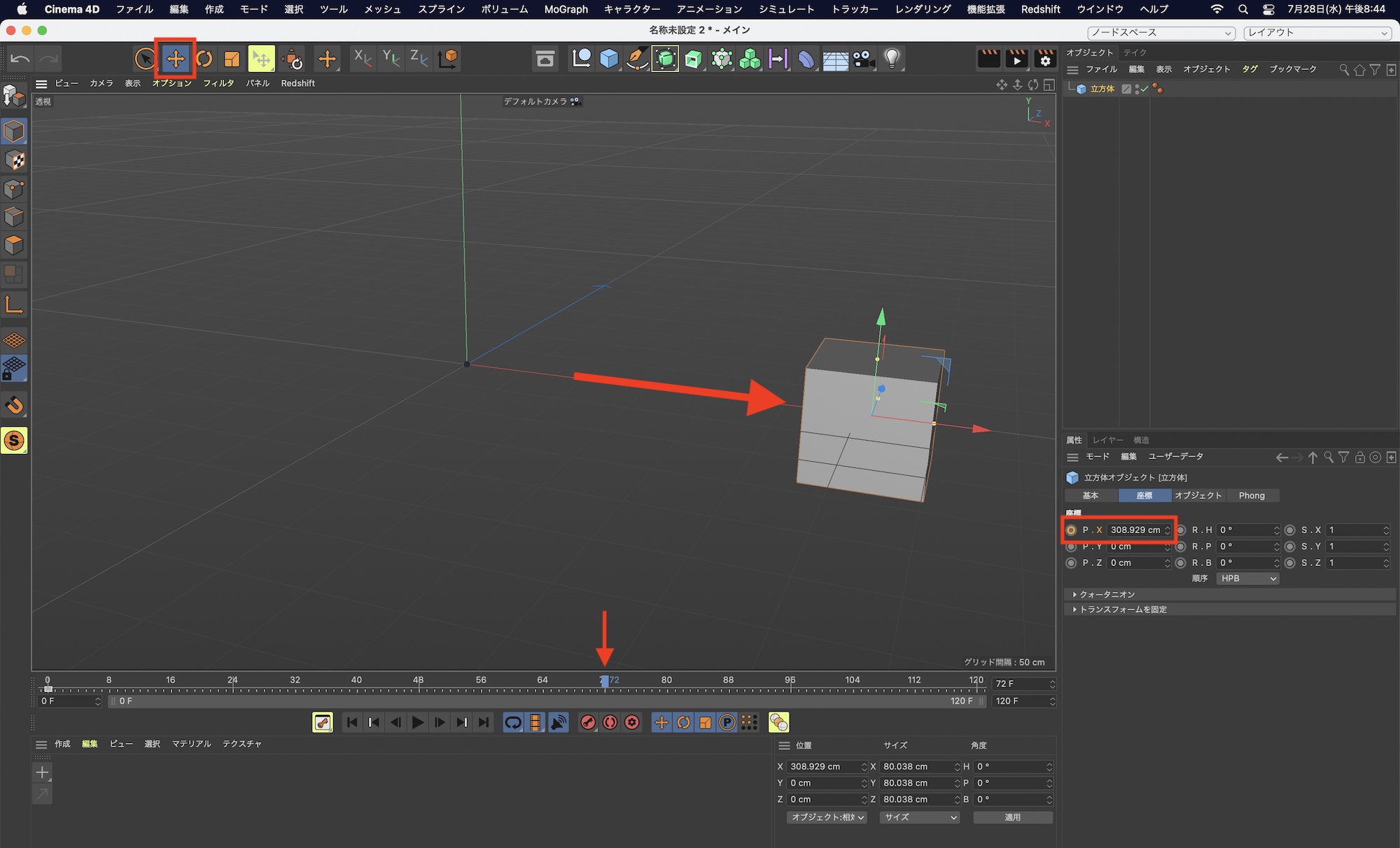 次に「72F」に移り、座標の「P.X」の数値または移動ツールを使用して立方体をX軸の方向に動かします。キーフレームアイコンがオレンジ色(確認の状態)になるので、再度クリックして赤色(確定)にします。