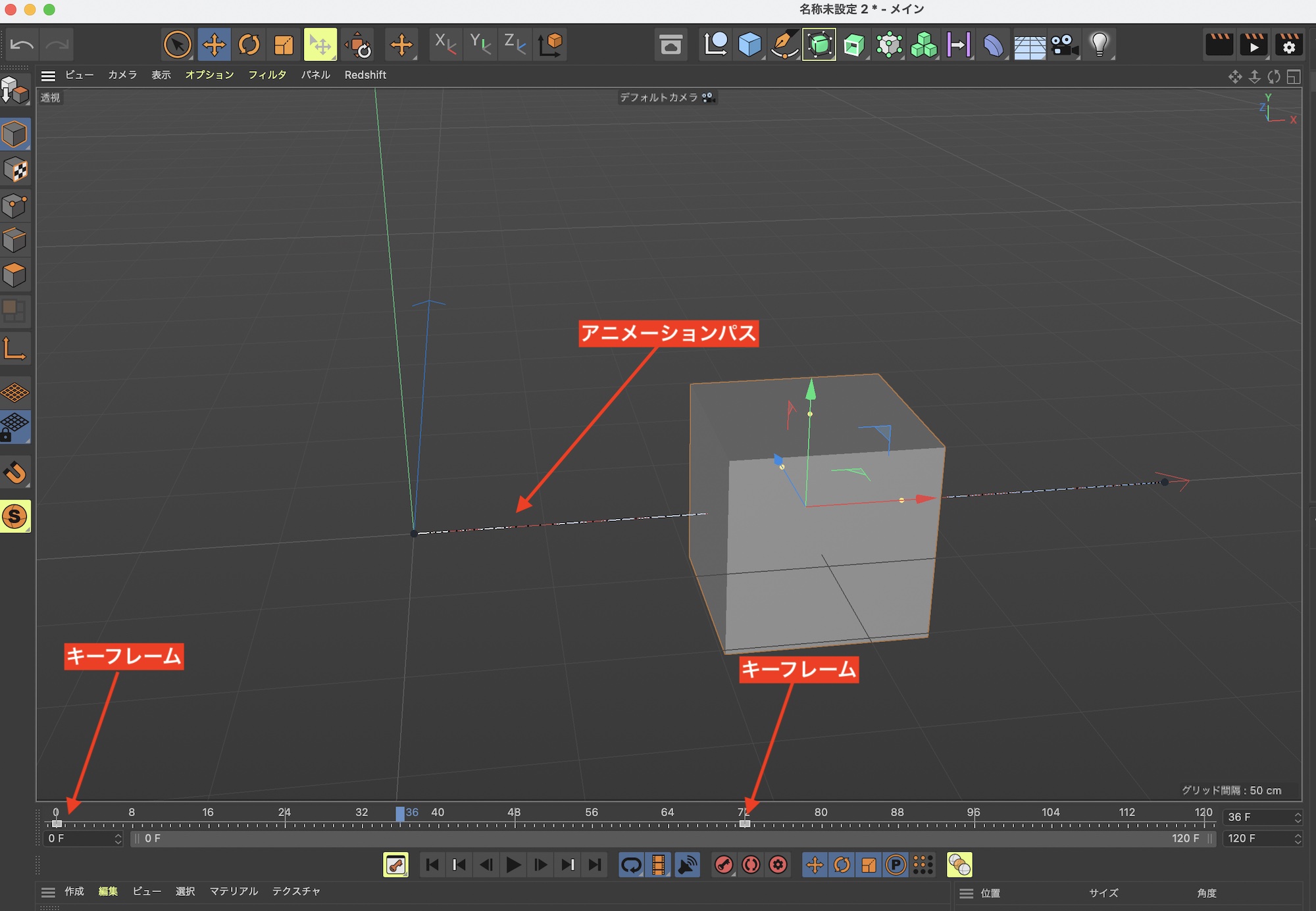 スペースバーまたは再生アイコンをクリックすると、立方体のアニメーションを確認することが出来ます。なお、ビューポートにはアニメーションの動きを線として表示する「アニメーションパス」が追加されます。