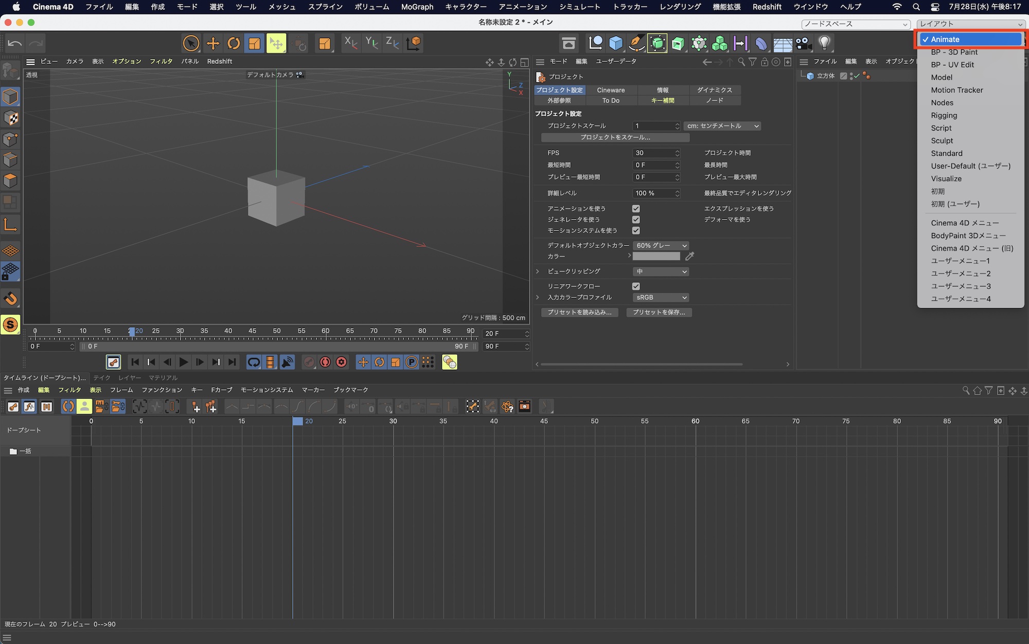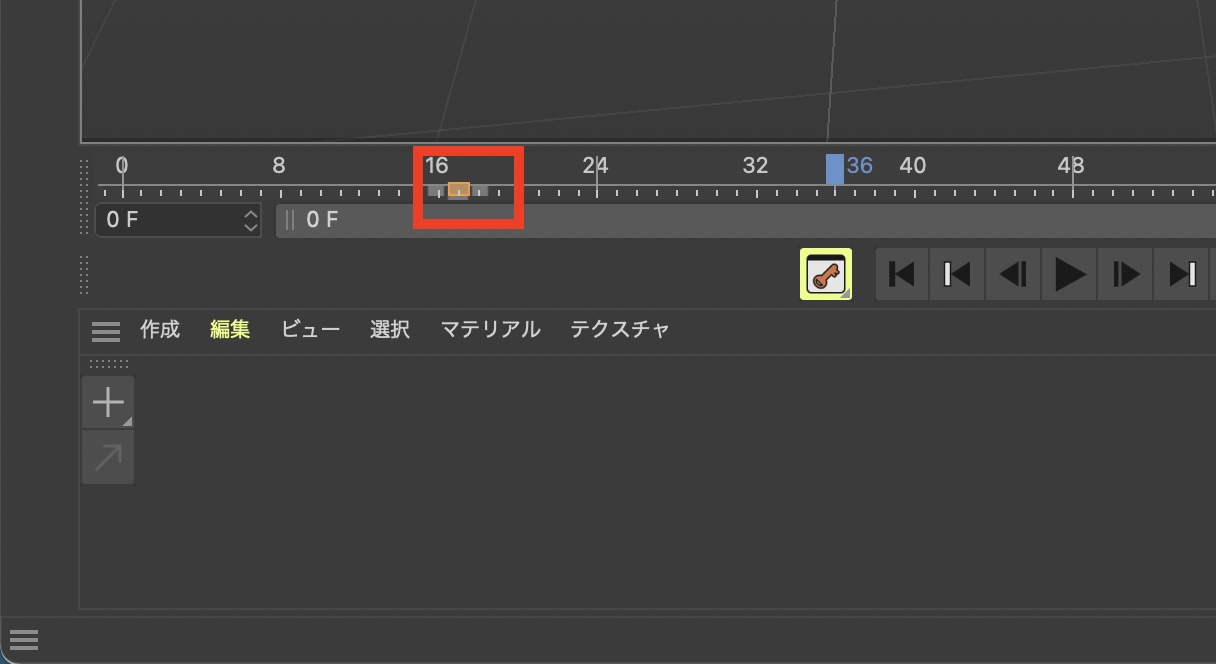Cinema 4Dのデフォルトレイアウトである「初期」ではタイムラインとキーフレーム操作に使用するツールが用意されています。
