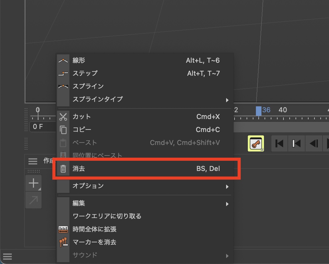 キーフレームを削除する場合はキーフレームを選択した上で「Delキー」または右クリック、「消去」から削除できます。