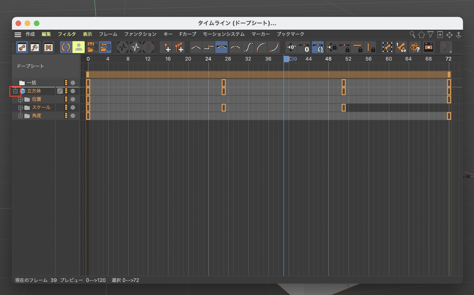 問題なくキーフレームが追加されていますが、この状態だとどのパラメータのキーフレームなのかタイムラインでは確認できないので、調整などを行う場合は「タイムライン(ドープシード)」または「タイムライン(Fカーブ)」を使用すると良いでしょう。