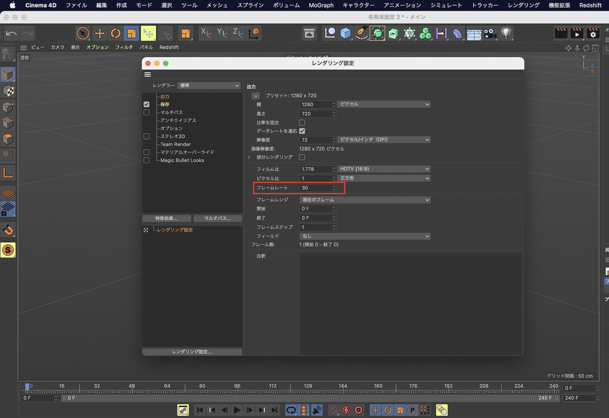 また、Cinema 4Dのプロジェクト設定でフレームレートを設定しても、出力時に違うフレームレートでレンダリングされてしまう可能性があるので、レンダリング設定の「出力」の項目からフレームレートを変更しましょう。
