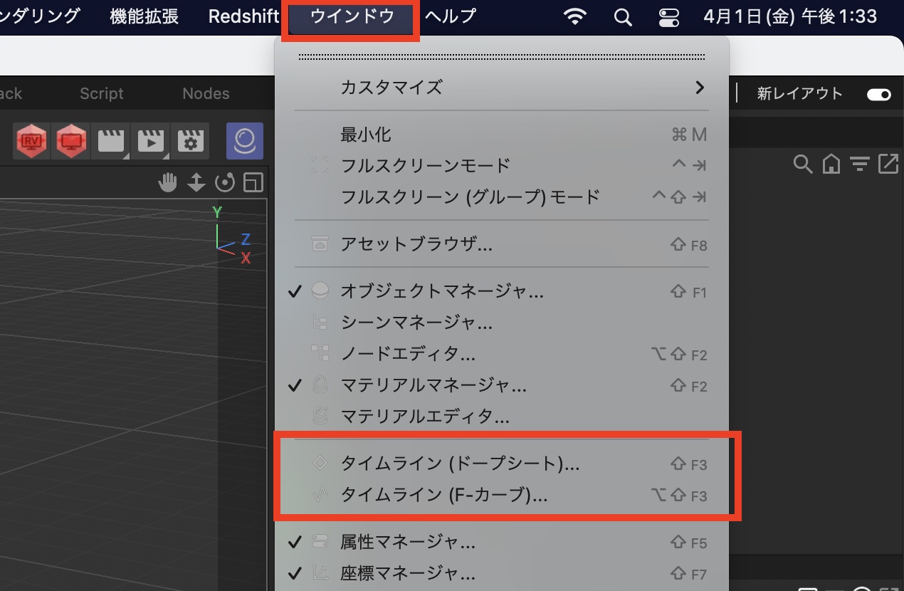 基本的に「初期」レイアウトでもキーフレームアニメーションを作成できますが、「タイムライン(ドープシード)」、「タイムライン(Fカーブ)」を表示させることでパラメータの全てのキーフレームやイージングの操作などを行うことが出来るようになります。