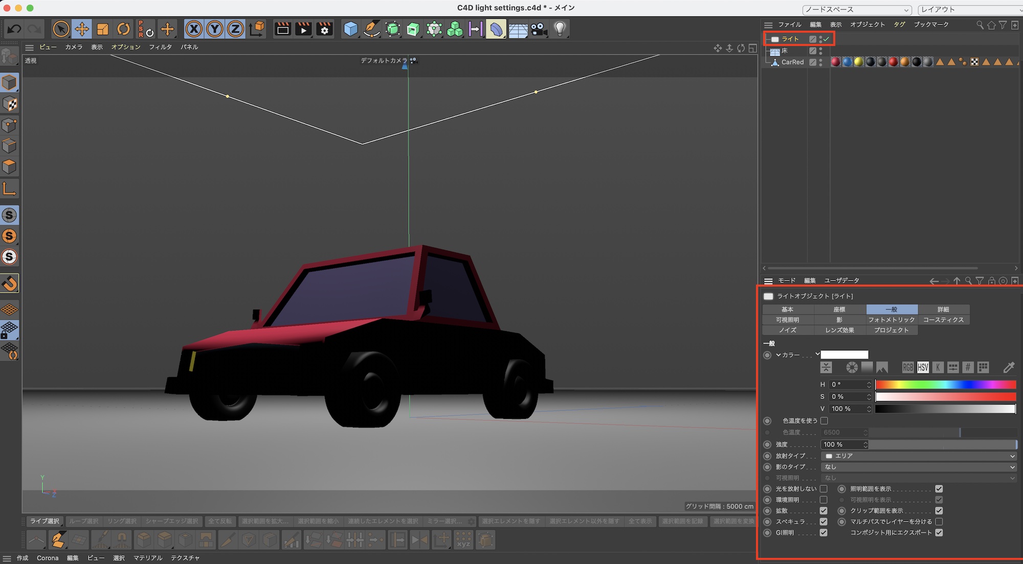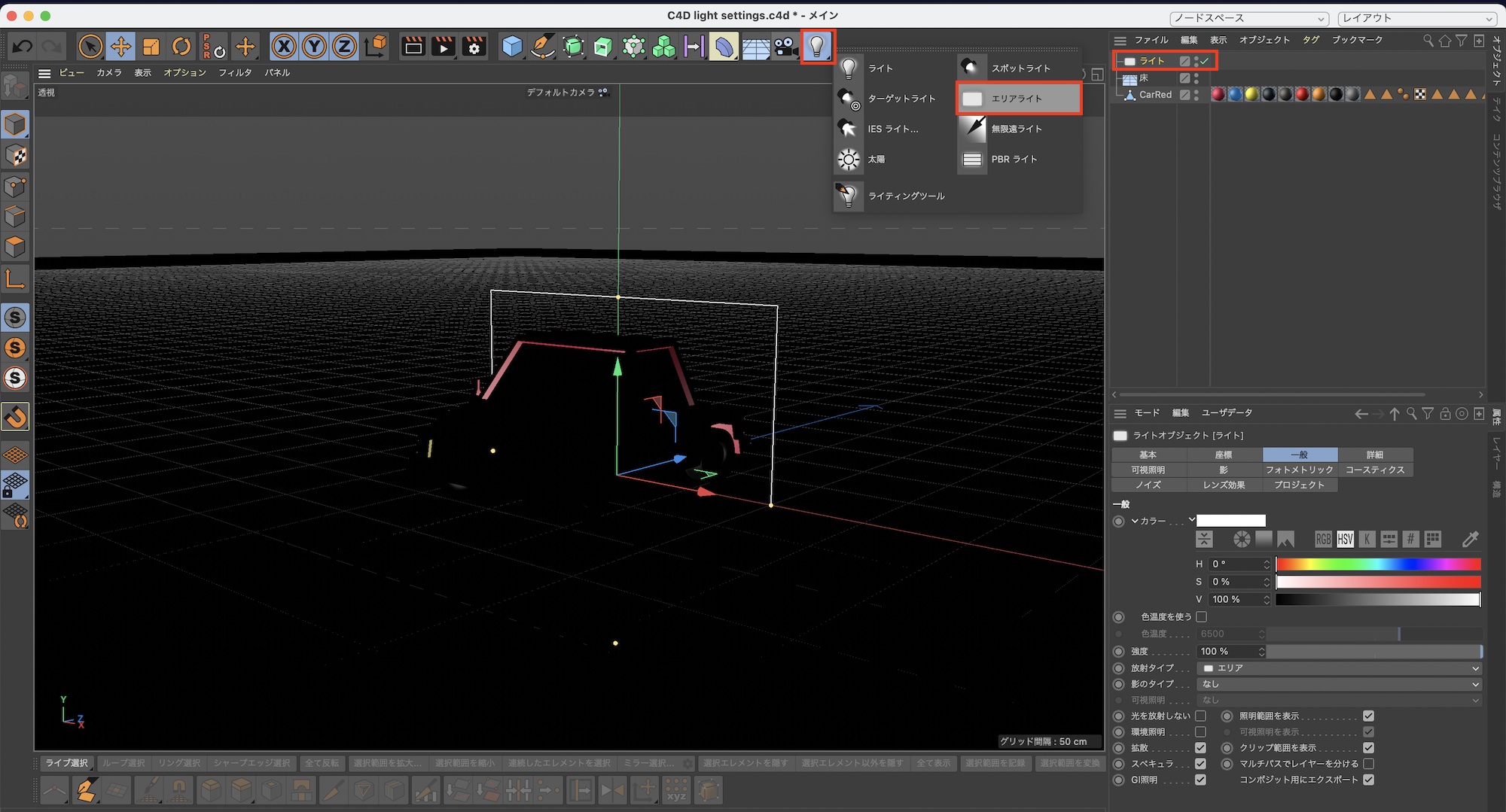 エリアライトを含むライトオブジェクトは調整したいライトオブジェクトを選択して、属性マネージャを開けば光の強さや色、影の設定などを行うことができます。