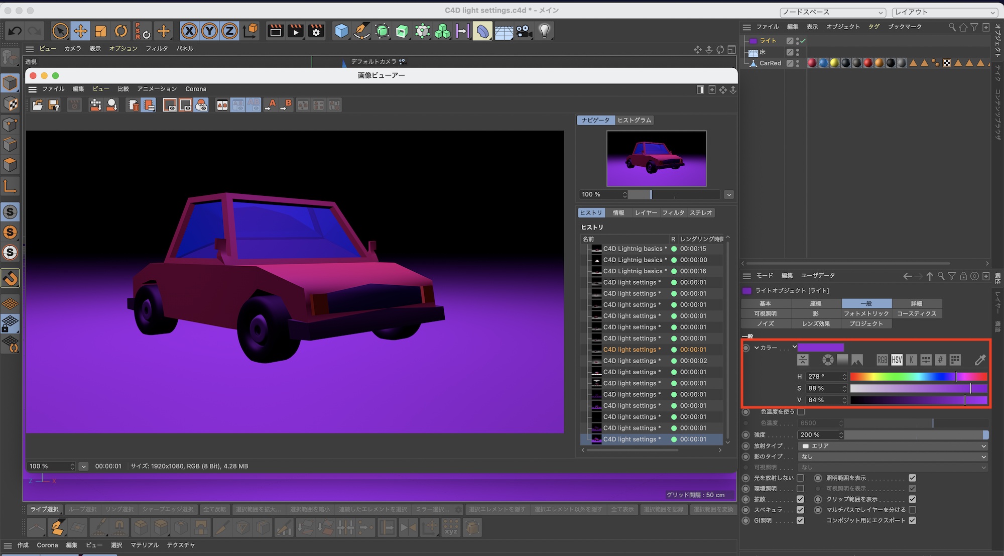 属性マネージャの「一般」設定では光の色や強度などの設定が行なえます。「カラー」の項目から好きな色に変更することができます。下の例ではエリアライトを紫色にしています。