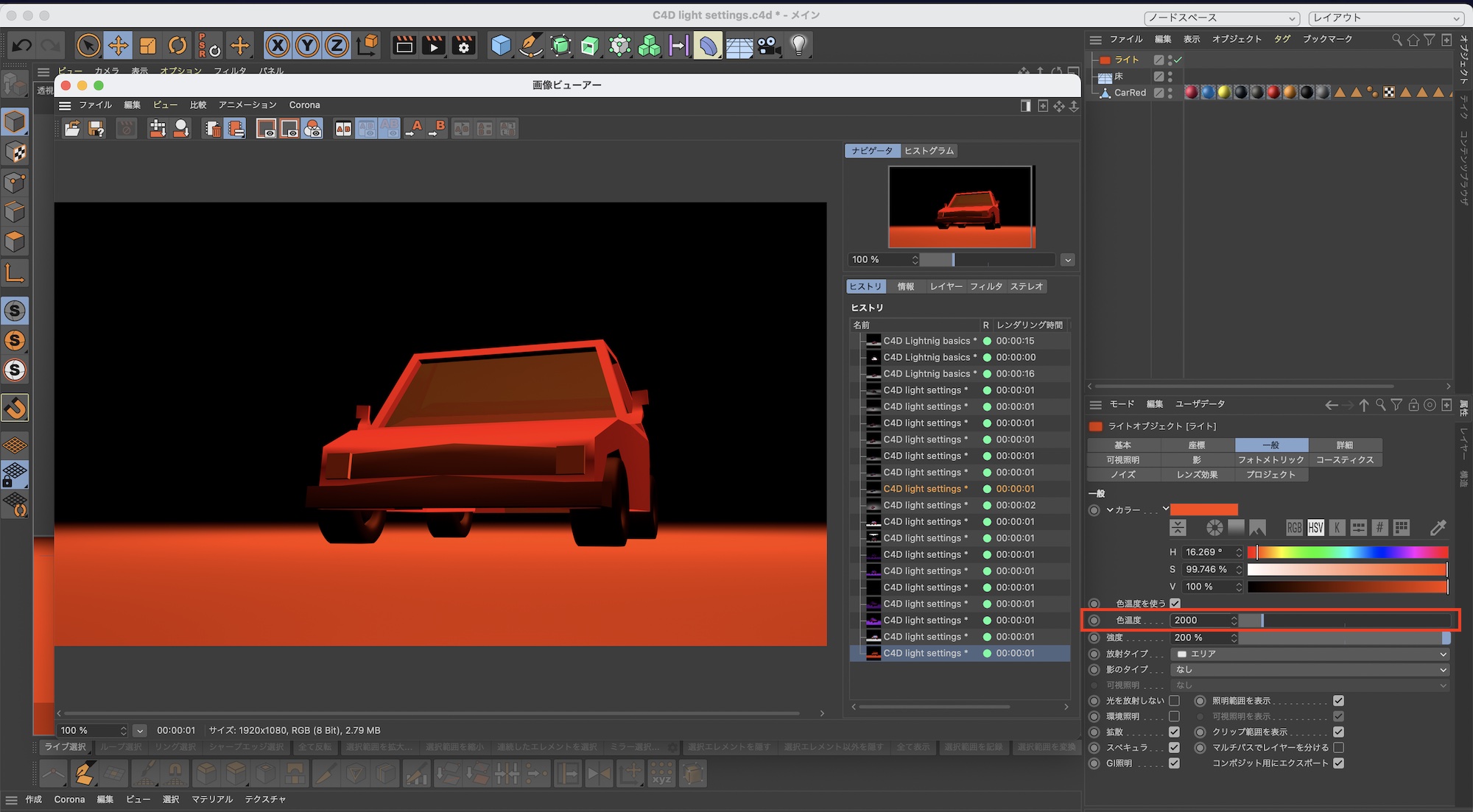 ホワイトバランスの設定に慣れている方は「色温度を使う」にチェックを入れるとケルビン(K)単位で設定できます。下の例では2000Kにした時のライトの効果です。