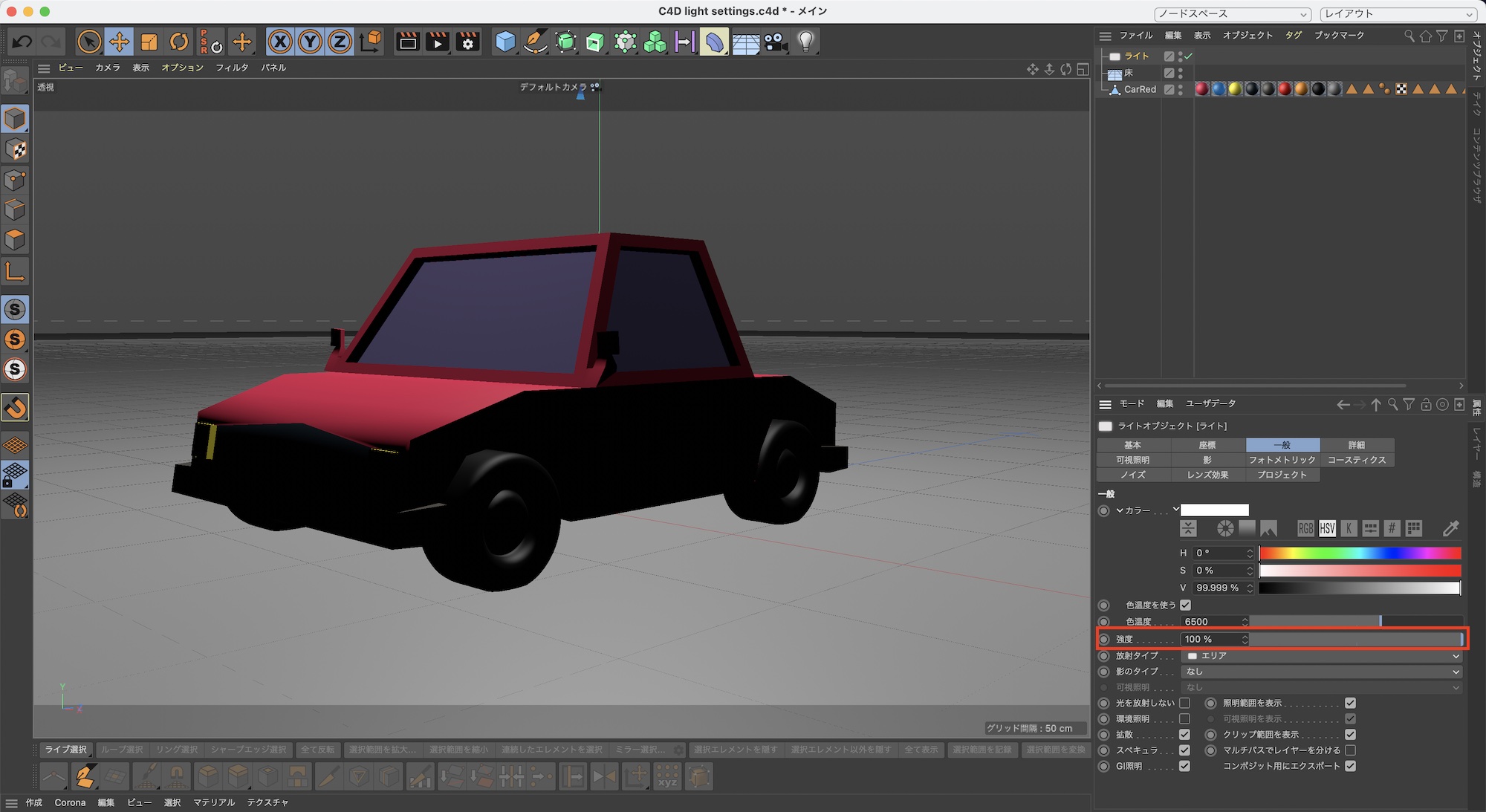 光の強さを設定する場合は「強度」の数値を変更します。使用するライトオブジェクトによってはデフォルトの100%でもちょうど良い場合がありますが、200%など数値に変更することも可能です。