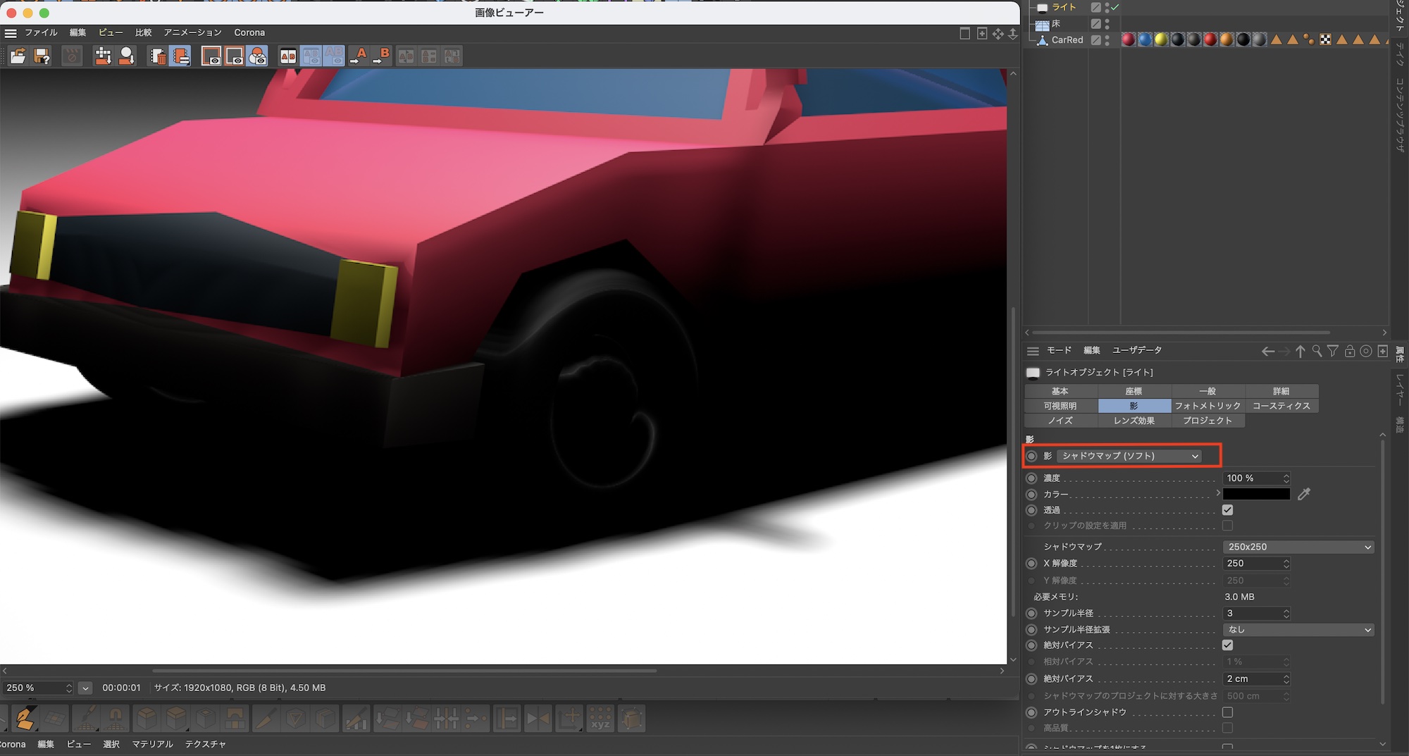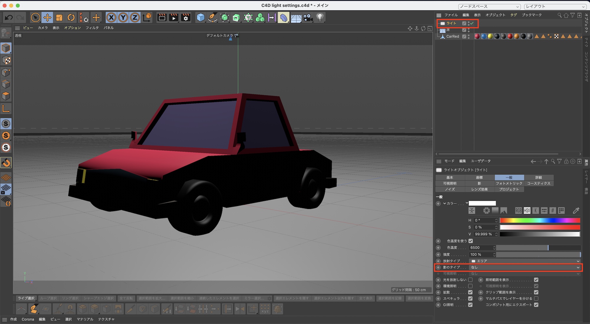 ライトを追加してもデフォルトの状態だと影が追加されないので、少し不自然に見えてしまいます。レンダリング設定からアンビエントオクルージョンの特殊効果を追加することも可能ですが、ライトオブジェクト単体で影の設定を行うこともできます。