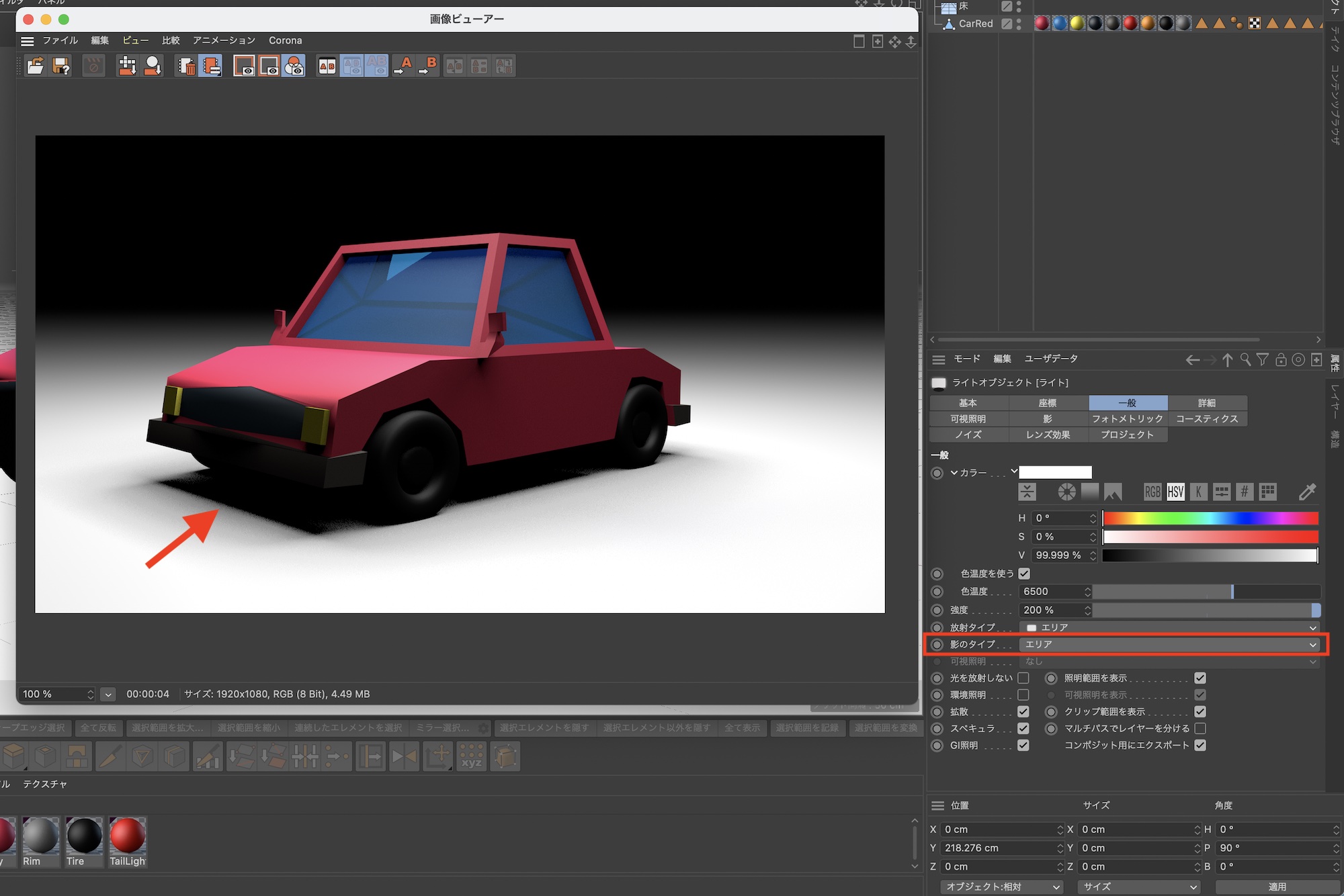 ライトオブジェクトを選択し、「一般」タブの中にある「影のタイプ」から「エリア」を選択してレンダリングを行うと、光の位置に合わせてオブジェクトに影が現れるようになります。