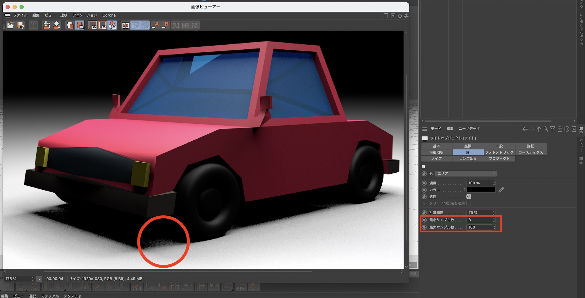 上の例では最小サンプル数が「8」、最大サンプル数が「100」の場合。影の部分のノイズが目立ち、荒く見えます。