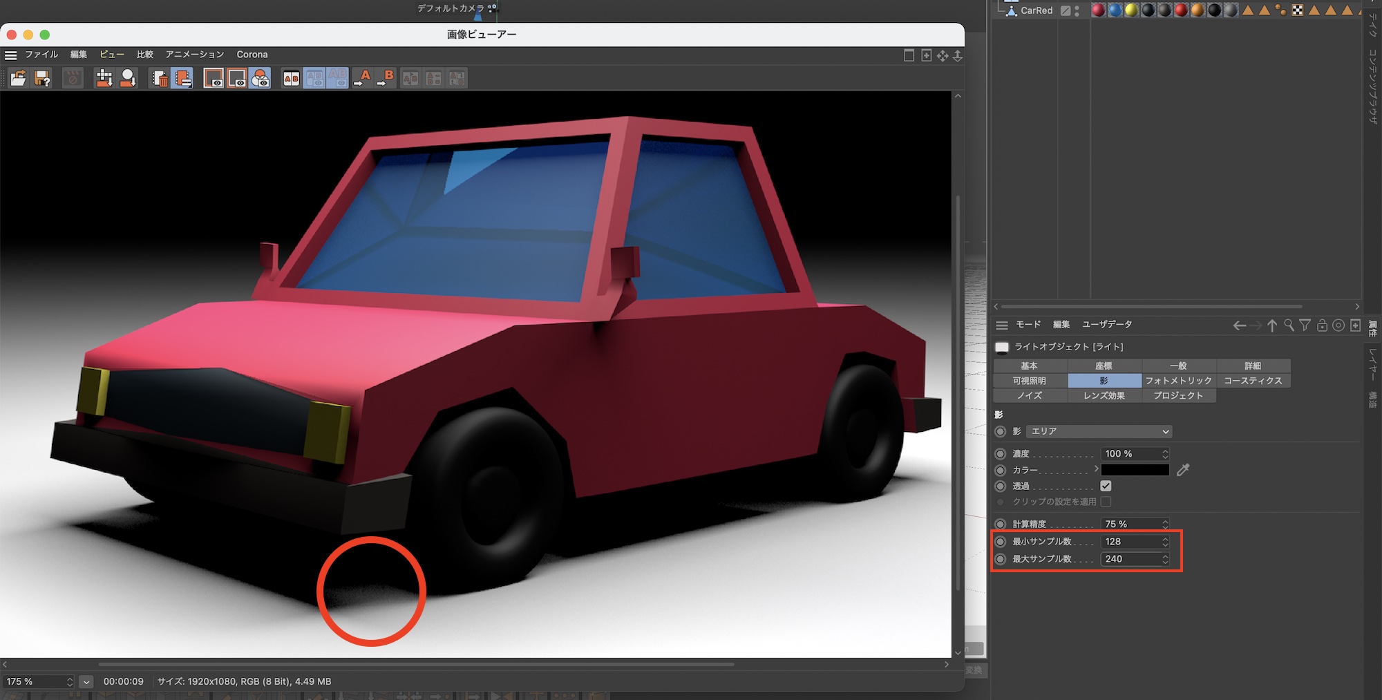 下は最小サンプル数が「128」、最大サンプル数が「240」の場合です。上と比べるとノイズが軽減され、影の質感もだいぶ自然になりました。サンプル数を上げることで、見た目をグッと変えることができますが、その分レンダリングに時間がかかるので注意しましょう。
