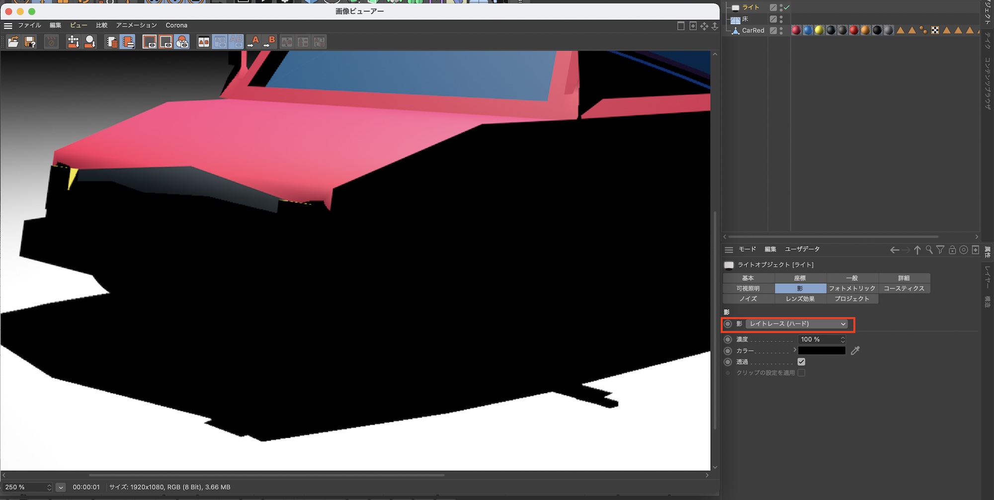 「レイトレース(ハード)」は光線(レイ)の計算を使って光がオブジェクトの遮り方によって作られる影です。レンダリング時間はとても早いですが、ハードシャドウになっているのが特徴的です。